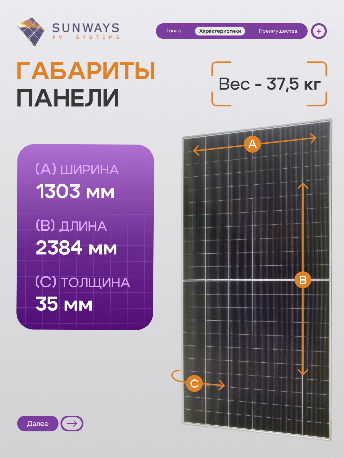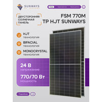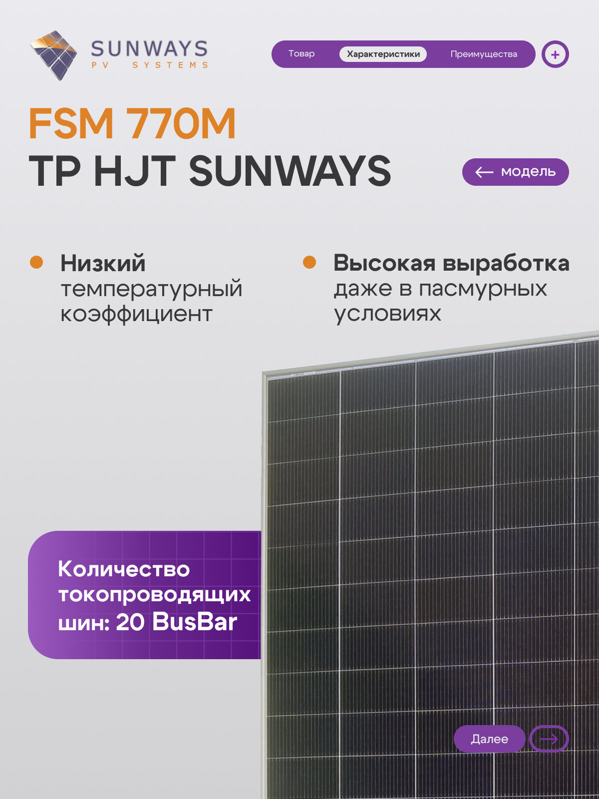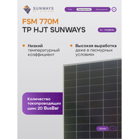 Флагманская солнечная панель премиум класса Sunways FSM 770M TP HJT - это новое поколение двусторонних солнечных батарей, выполненных по передовой технологии Half cell HJT Bifacial. Благодаря использованию HJT Bifacial технологии, солнечная панель генерирует электричество с обеих сторон. Максимальная мощность лицевой стороны 700 ватт, тыльной 70 Ватт. В модулях HJT Bifacial используются солнечные элементы последнего поколения размером 182x182 мм (M10), что обеспечивает ряд преимуществ и более низкий температурный коэффициент.