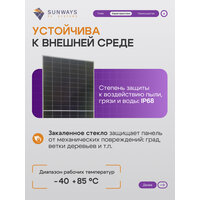 Защита от негативных последствий затенения модуля - известный факт, что даже при затенении небольшой части стандартного солнечного модуля, его производительность резко падает и фактически стремиться к нулю, подтягивая за собой все солнечные панели, находящиеся в последовательной цепи подключения. Затенение может быть вызвано снегом, рядом стоящим деревом или конструкциями на крыше (дымоходом, лестницей и т. д.). Новое поколение солнечных батарей Sunways FSM TP лишены этого недостатка. Даже если половина солнечной батареи находится в тени, вторая часть модуля будет работать на все 100%, генерируя максимум энергии несмотря на обстоятельства.