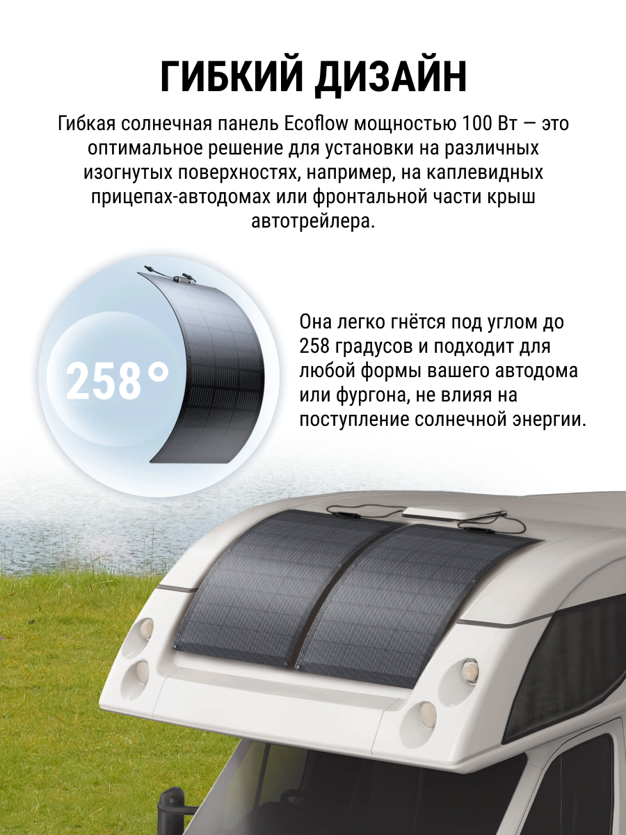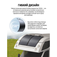 Гибкая солнечная панель Ecoflow мощностью 100 Вт - это оптимальное решение для установки на различных изогнутых поверхностях, например, на каплевидных прицепах-автодомах или фронтальной части крыш автотрейлера. Модель EcoFlow 100W отличается не только особой гибкой конструкцией, но и долговечностью, высокой эффективностью и хорошей защитой от воды и пыли. Она совместима со многими компонентами для автономной солнечной генерации, в том числе других брендов.