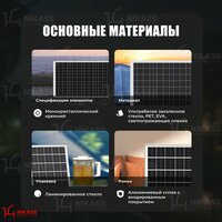 Материалы: Монокристаллический кремний (высокий КПД) Ультрабелое закаленное стекло (устойчивость к нагрузкам и УФ-излучению) Многослойная структура: PET, EVA, светоотражающая пленка (долговечность и защита) Анодированная алюминиевая рамка (прочность и коррозионная стойкость)
