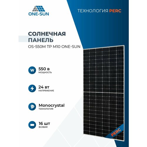 Солнечная панель 550 Вт премиум класса One-Sun OS-550M TP (Twin power)- это новое поколение солнечных модулей, выполненных по передовой технологии Half cell PERC. Благодаря использованию последних технологий, эффективность солнечных модулей One-Sun OS-TP превышает 21%! По сравнению со стандартными модулями, наши Half cell модули более эффективны, имеют большую выработку и меньше перегреваются в условиях частичного затенения. Также эти модули лучше работают в случае повреждений, чем стандартные модули. Солнечная панель изготовлена из высокоэффективных монокристаллических солнечных элементов первой категории качества Grade A, что гарантирует повышенную производительность и надежность модуля. В процессе производства используются только высококачественные и сертифицированные компоненты производителей с мировым именем и многолетним опытом работы в области солнечной энергетики. Наши солнечные модули одобрены независимыми европейскими и американскими агентствами солнечной энергетики и рекомендованы к продаже в Европе и США. Не верьте маркетинговым слоганам, заказным обзорам и отзывам в сети, верьте фактам! Солнечные модули One-Sun OS-применяются в крупнейших и наиболее амбициозных проектах солнечной энергетики России и СНГ. Один из таких проектов: Электрификация удаленных поселков Сибири и Установка СЭС на отделения ПАО "Сбербанк" Технологическое преимущество модулей One-Sun OS-серии Twin Power Защита от негативных последствий затенения модуля - известный факт, что даже при затенении небольшой части стандартного солнечного модуля, его производительность резко падает и фактически стремиться к нулю, подтягивая за собой все солнечные модули, находящиеся в последовательной цепи подключения. Затенение может быть вызвано снегом, рядом стоящим деревом или конструкциями на крыше (дымоходом, лестницей и т. д.). Новое поколение модулей One-Sun OS-TP лишены этого недостатка. Даже если половина солнечного модуля находится в тени, вторая часть модуля будет работать на все 100%, генерируя максимум энергии несмотря на обстоятельства. Новейшая Multi 11 Busbar технология солнечных элементов - 11 коротких токопроводящих шин (Bus bar) обеспечивают целый ряд преимуществ перед аналогами с пятью токопроводящими шинами: 1. Чем короче Bus bar, тем меньше проводник, тем меньше потери энергии на нем. Меньшее сопротивление уменьшает потери мощности до 6% и увеличивает выходную мощность модуля от 5 Вт до 15 Вт. 2. Снижает последовательное сопротивление и ток на токопроводящих шинах, что приводит к уменьшению вероятности появления локального перегрева элемента в солнечном модуле; 3. Уменьшает утечки тока, значительно повышает производительность в пасмурную погоду; 4. Новый дизайн снижает стрессовые нагрузки на токопроводящие шины, что значительно снижает вероятность появления дефектов в процессе эксплуатации (микротрещины, дефекты пайки, локальный перегрев (Hot Spot)), обеспечивая большую надежность и высокие показатели производительности на протяжении всего срока эксплуатации; 5. Вдвое больше стрингов в модуле: вместо обычных 6 стрингов (рядов) в традиционном 60-ти элементном модуле, Half cell солнечная батарея состоит из 12 стрингов. Это помогает уменьшить потери мощности модуля в следствии разной мощности каждого элемента, а также разницы в их деградации со временем. 6. Элементы меньшего размера: вдвое меньшие эл