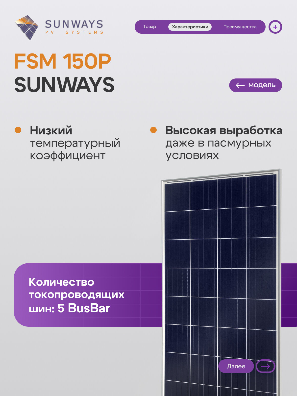 Солнечная панель 150вт Sunways FSM 150P, солнечная батарея для дома, для дачи, 12В, 1шт.: сравнение цен, характеристики, фото, актуальное наличие и цены.