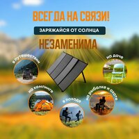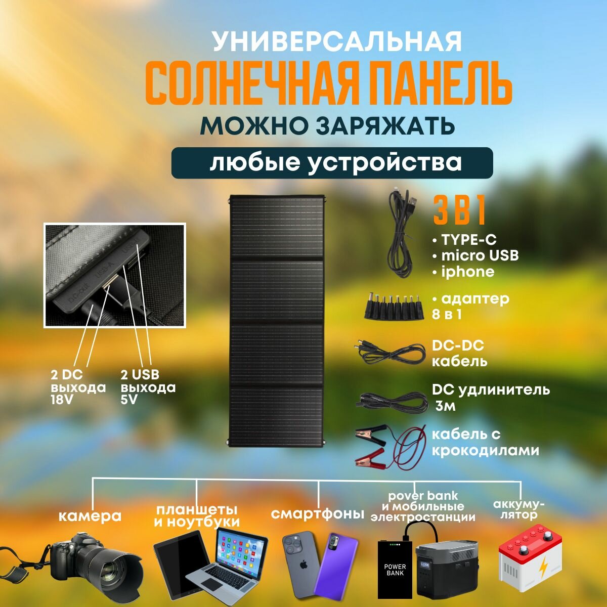 Портативная солнечная панель на 120Вт с функцией быстрой зарядки будет Вашим незаменимым помощником в походе, на кемпенге, на рыбалке или охоте, на даче, в путешествии и в любых других ситуациях без источника питания.