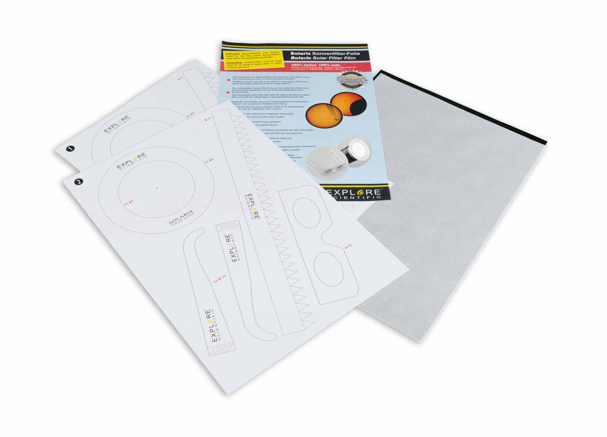 Explore Scientific Solarix Solar Filter Film A4 – специальный фильтр-пленка предназначенный для создания аксессуаров для безопасного наблюдения Солнца. Пленка 100% безопасна и пропускает всего 1/1000 от 1% входящего света. Солнечный фильтр подойдет для наблюдения солнечных затмений, пятен на Солнце, транзитов планет и многого другого. Прочная, устойчивая к любым повреждениям пленка имеет идеально ровную поверхность без заломов и складок, которые вносят искажения в передаваемые изображения. Благодаря этому пленку можно использовать для астрофотографий. При наблюдении Солнца пленка создает естественный желтый цвет. В комплект поставки входит трафарет для создания солнечного фильтра или очков для наблюдения солнечных затмений. Создайте свой индивидуальный солнечный фильтр для телескопа, бинокля, фото- или видеокамеры.