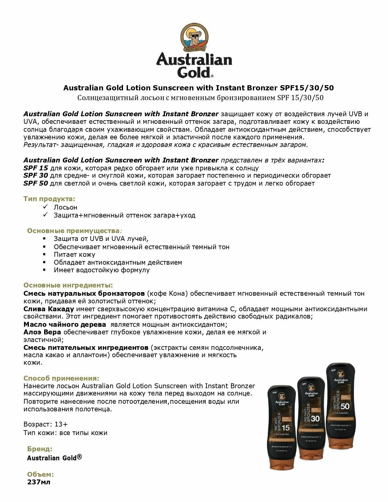 Солнцезащитный лосьон для тела и шеи с мгновенным бронзированием SPF 30 — Australian Gold: сравнение цен, характеристики, фото, актуальное наличие и цены.