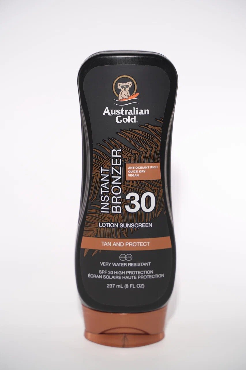 Купить Солнцезащитный лосьон для тела и шеи с мгновенным бронзированием SPF 30 — Australian Gold с доставкой по всей России.
