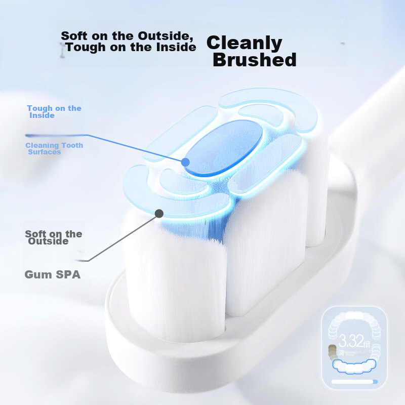 Насадки Soocas содержат на 40 процентов больше щетинок, чем у обычных щеток, за счет новой технологии их плотного размещения. Поскольку большее количество щетинок соприкасается с поверхностью зубов во время чистки, они могут эффективнее удалять загрязнения даже в труднодоступных местах. Концы щетинок скруглены, чтобы не повредить десна и зубную эмаль. Насадки поставляются в гигиеничной вакуумной упаковке.
