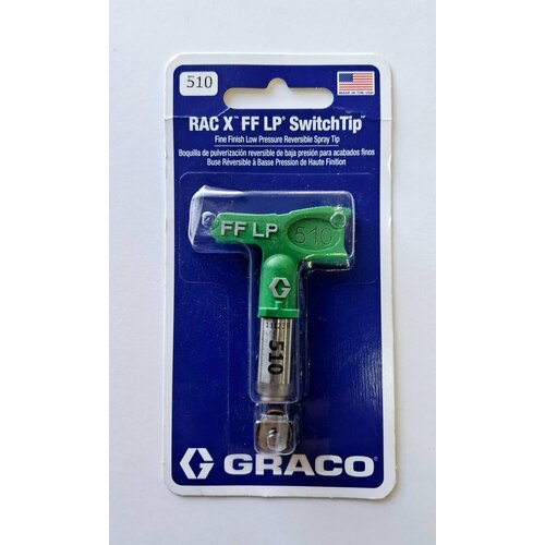 Сопло для краскораспылителя безвоздушного распыления Graco FFLP 510\nПроизводитель: Graco\nДанные сопла подходят к окрасочным аппаратам безвоздушного распыления Graco, \nЗеленое сопло FFLP 510 для качественной отделки при самом низком давлении.\n\nФинишное сопло Graco FF LP 510 обладает уникальной запатентованной внутренней геометрией по технологии SmartTip, которая обеспечивает лучшее в индустрии качество безвоздушного распыления при пониженном давлении.\n\nСопло FF LP 510 осуществляет распыление при давлении на 50% ниже, с пониженным образованием окрасочного тумана, что обеспечивает единообразное качество отделки с полной атомизацией.\n\nБлагодаря размеру экологическое сопло FFLP 510 пригодно не только для финишной окраски, его можно использовать для обработки больших площадей стен при высоком расходе материала.\n\nСопло FF LP 510 устанавливается в соплодержатель RAC X краскораспылителя.\n\nИдеально для выполнения внутренних окрасочных работ и окраски объектов жилищного строительства.\n\nПоворот реверсивного сопла на 180 с последующей продувкой краской под давлением, позволяет устранить засор во время работы (рекомендуется перед поворотом сопла ослабить гайку соплодержателя). Сопло обозначается тремя цифрами. Первая цифра указывает на величину угла факела распыления в десятках градусов, т. е чем больше цифра, тем более широкий получается факел, следовательно, можно покрыть краской более широкий участок окрашиваемой поверхности за один проход. Оставшиеся цифры указывают на величину диаметра сопла в тысячных долях дюйма.\n\nСопло для краскопульта крепится в соплодержатель. Если сопло забивается - его поворачивают на 180 градусов и продувают напором ЛКМ.