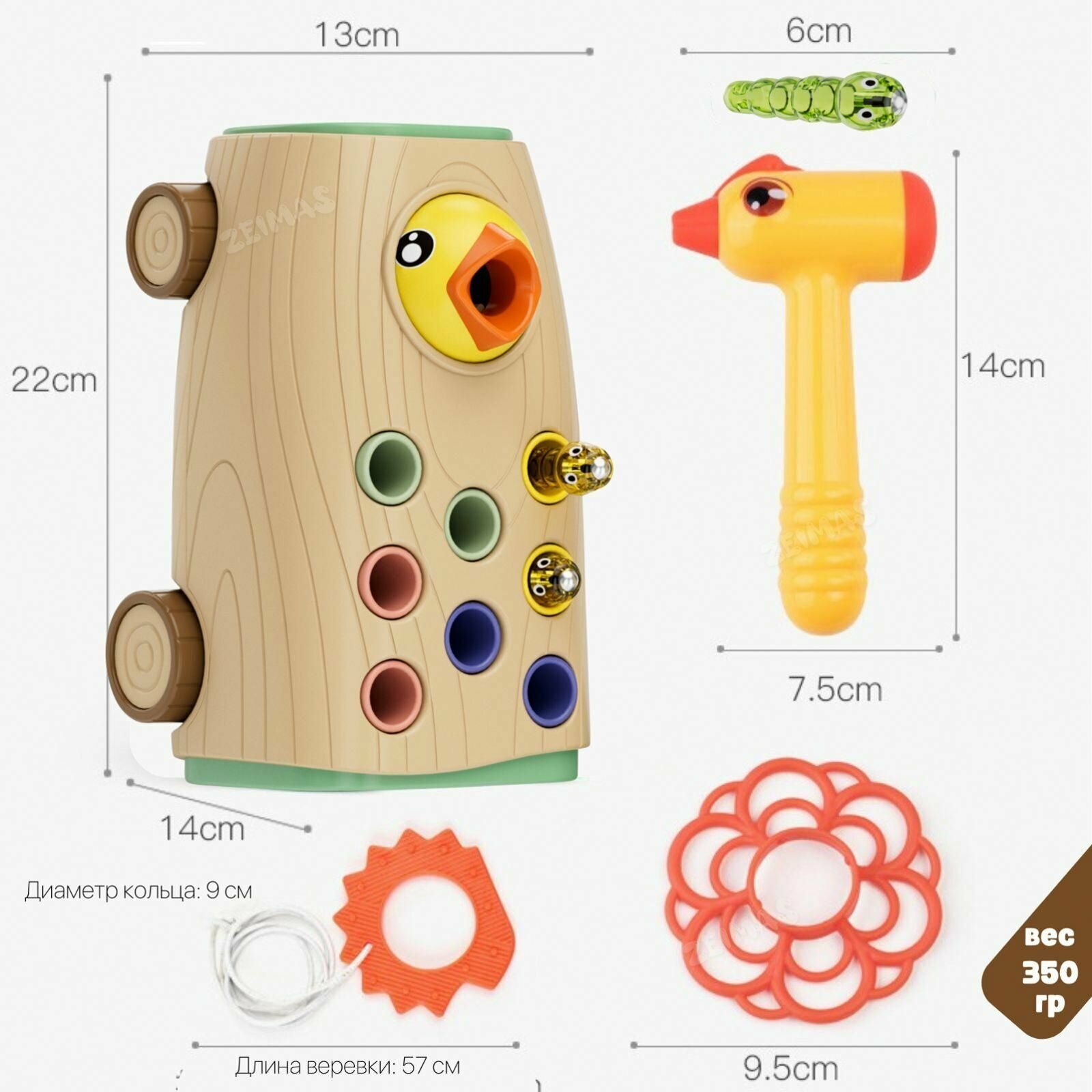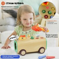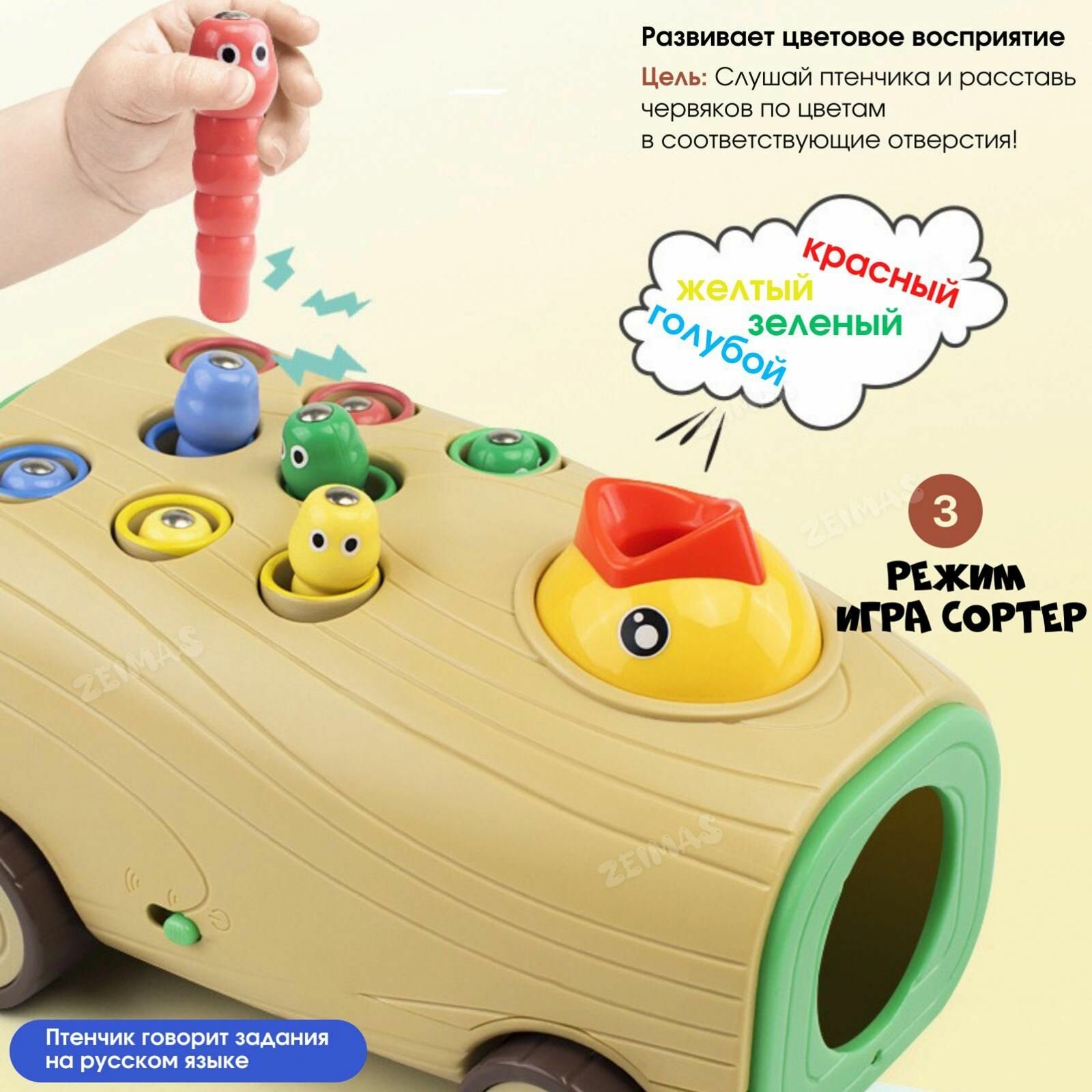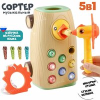Игрушки для малышей Сортер "Птенчик Ева" - это развивающая детская игрушка 5 в 1, обогащенная озвучкой на русском языке и заданиями, предлагаемыми милым птенчиком. В этой увлекательной игре дети могут развивать различные навыки, под руководством дружелюбного птенчика. Вот подробное описание режимов и целей игры: Режим игры "Стукни червяка": Развивай реакцию и ловкость! Следуй инструкциям птенчика, который подсказывает задание. Твоя цель - максимально быстро и точно стукнуть по подсвеченным червякам. Зарабатывай очки и продвигайся на следующий уровень! Режим игры "Пианино": Развивай музыкальный слух! Используй молоточек, чтобы "играть" по червякам, создавая музыку, как на пианино. Птенчик будет подсказывать мелодии и ритмы. Режим игры "Покорми птенчика": Развивай цветовое восприятие! Послушай внимательно, что говорит птенчик, и расставь червяков по цветам, соответствующим отверстиям. Усовершенствуй свои навыки сортировки! Режим игры "Покорми птенца": Развивай мелкую моторику! Птенец голоден, и ты можешь покормить его червяками. Наслаждайся веселыми звуками и мелодиями, которые звучат, когда ты кормишь птенца. Более того, мелодии доступны на английском языке, предоставляя тебе возможность изучать два языка. Игра "Каталка": Развивай физическую активность! Привяжи мягкий держатель-колечко на веревочку и катай игрушку, как настоящую машинку. Этот режим стимулирует двигательные навыки и весело проводит время. "Сортер Птенчик Ева" - это увлекательный способ развивать множество навыков, начиная от физической активности и заканчивая музыкальным слухом и логическим мышлением. Ребенок может активно учиться, играя и весело проводя время в компании птенчика Евы. Высококачественная развивающая игрушка, созданная из безопасных материалов для детей. Она представляет собой многогранную и увлекательную опцию для малышей с возрастом 0+ лет. Особенность игрушки - червяки, которые светятся в темноте. Этот визуальный эффект будет радовать и удивлять ребенка, создавая интересный игровой опыт. В игре ребенок приобретает реакцию ловкость музыкальный слух, цветовое восприятие, моторику рук, узнавание цветов и форм. Присутствие магнитной рыбалки добавляет интересный элемент в игру. Ребенок может "ловить" червяков с помощью магнитной рыбки, развивая моторику и координацию. Игрушка предлагает дополнительные активности и возможности для развития по сравнению с обычными деревянными бизибордами. Он представляет собой более многофункциональный и увлекательный вариант для развития навыков. Подходит как для девочек, так и для мальчиков. Она идеально сочетается с интересами и потребностями разных детей. Станет идеальным подарком на день рождения ребенка, на Новый Год или даже в качестве подарка к новоселью. Эта настольная игра понравится как самому ребенку, так и его родителям. Это не просто игрушка, а полноценный инструмент развития для самых маленьких. Сочетание разнообразных режимов, безопасных материалов и интересных игровых элементов делает эту игрушку привлекательной и познавательной для детей всех возрастов. Размер сортера: 22*13*14 см. Размер упаковки: 27*14*15см. Упаковка: Картонная упаковка на русском языке + защитная пленка Материал: Пластик ABS, силикон Батарейки: AA 3 шт (1,5 V), нет в комплекте) Не кипятить! Не стерилизовать! Прекрасный подарок игр