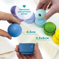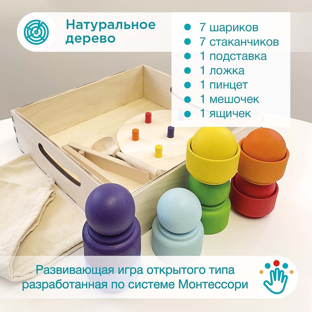 Сортер «Гнездышки. Радуга» - это игровой набор открытого типа, разработанный в соответствии с образовательной системой Монтессори. Главная задача - правильно разместить шарики в стаканчиках или расположить их на доске. QR-код на инструкцию к играм указан на упаковке. Хорошо подходит для детей от 1 до 5 лет. Внимание: Детям до трех лет игрушку рекомендуем давать под присмотром взрослых. Помогает развивать: зрительное внимание; мышление; память; сенсорику и мелкую моторику; усидчивость; старательность; внимательность; навыки сравнения, классификации и анализа. Изучить понятия: сверху или снизу, внутри или снаружи, над или под. Его можно использовать как дома, так и для развития в игровых комнатах, детском саду. Детали выполнены из древесины липы. Цветные элементы окрашены немецким натуральным воском BIOFA, сертифицированным для детской игрушки. Тактильны и удобны для детских рук. Крупный размер шариков безопасен даже для самых маленьких. Внимание: окрашенные натуральным воском элементы не следует мыть с мылом, их только аккуратно протирают сухой или чуть влажной тряпочкой. Состав: 7 шариков диаметром 4,5 см, 7 стаканчиков 3,5х6 см, деревянная подставка со штырьками, ложка, пинцет, льняной мешочек для шариков; деревянный поднос для хранения. Веселая развивашка – это отличный подарок на любой день и событие: новогодние праздники, день рождения, 8 марта. Игры с сортером будут радовать вашего ребенка и сопровождать его взросление, грамотно развивая каждый день. Проводите домашнее время вместе, хвалите любимого кроху за достижения и напоминайте ему, какой он большой молодец! Упаковка товара – картонная коробка, которая может стать также подарочной.