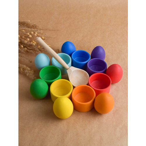 Сортер с ложкой стаканчики с радужными яичками и ступками по методике Монтессори - это отличная идея познакомить малыша с различными цветами в игровой форме. Этот деревянный сортер развивайка Монтессори по цветам для малышей открытого типа, разработана в соответствии с известной образовательной системой Марии Монтессори для раннего развития детей, в том числе для детей первого года жизни. Деревянные игрушки развивашки для раннего развития малышей способствуют развитию мелкой моторики и речи. Основная задача в этой деревянной развивающей игрушке сортере тренажере Монтессори для малышей детей - разложить яички разных цветов по соответствующим им цветам стаканчикам. Малыш может делать это руками или использовать ложку. Усложнить детскую эко игрушку развивайку для малыша можно попробовать разложить шарики по ступкам с помощью китайских палочек.
