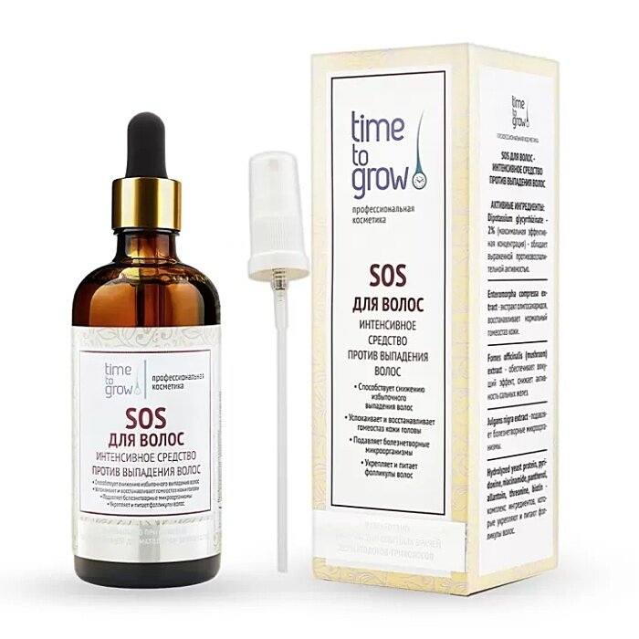 SOS (Тайм ту гроу)- интенсивное средство против выпадения волос. Препарат разработан прицельно для борьбы с избыточным выпадением и не является стимулятором роста волос. Предупреждает и замедляет преждевременный переход волос из фазы анагена (роста) в телоген (отдыха) и процесс потери волос, уже перешедших в телоген. Лосьон укрепляет и питает волосяные фолликулы.