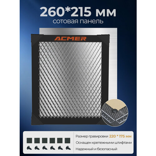 Сотовая пластина ACMER - улучшите свой опыт лазерной гравировки ✨ Размер: 260x215 мм (рабочая область 220x175 мм) ✨ Фиксированная верхняя часть и вспомогательные накладки - В комплект входят 6 штифтов: для фиксации объекта гравировки; 4 накладки: для увеличения пространства для отработанного материала и уменьшения пожелтения пластины. Широкий диапазон совместимости - Совместим с CO2, диодными и волоконными лазерными гравировальными станками - Подходит для всех типов гравировальных станков ✨ Быстрое измерение - Хорошо читаемые и точные градуированные линии для легкого определения размеров ✨ Двойная защита рабочего стола - Научно разработанная высота сот предотвращает повреждение лазера - Для дополнительной защиты предусмотрена устойчивая к порезам металлическая опорная пластина