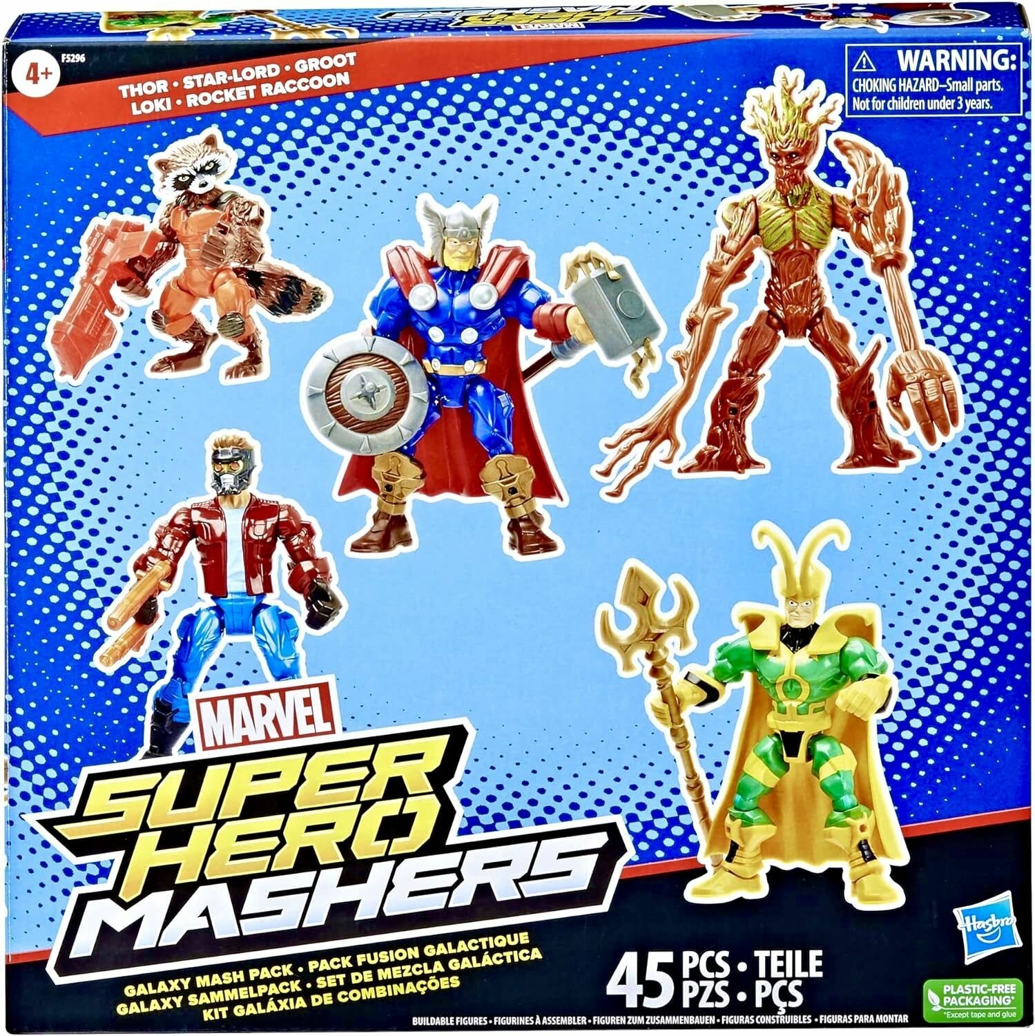 Создайте уникальных супергероев с набором Marvel Super Hero Mashers Galaxy Mash Pack! Этот набор включает 5 культовых персонажей Marvel: Тор, Звездный Лорд, Грут, Локи и Ракета Ракун. Фигурки обладают съемными частями, которые можно смешивать и комбинировать для создания своего собственного супергероя. • 5 героев Marvel: Набор включает 6-дюймовые фигурки Thor, Star-Lord, Groot, Loki и Rocket Racoon. • Съемные части: Отсоединяйте головы, руки, ноги и заменяйте их, создавая совершенно новые образы! • 40+ аксессуаров: Используйте детали из набора, чтобы модернизировать героев или создавать уникальные боевые комбинации. • Игровая вселенная Marvel: Дизайн и аксессуары вдохновлены культовыми персонажами и сюжетами комиксов Marvel.