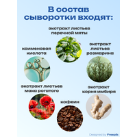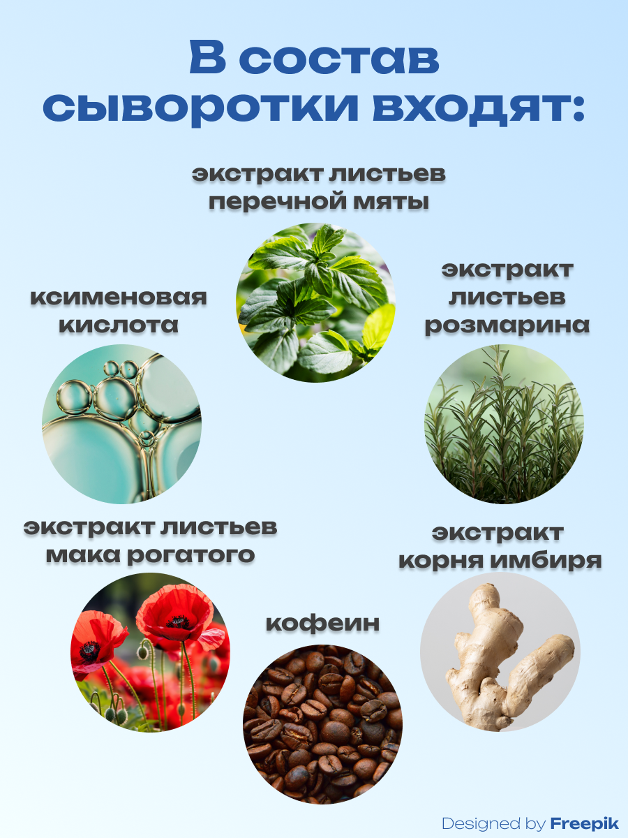В составе сыворотки 15 активных компонентов — герань, алоэ, папайя, перечная мята, имбирь, яблоко, петрушка, шалфей, укроп, ромашка, дудник, мак, тимьян, тысячелистник и перец.