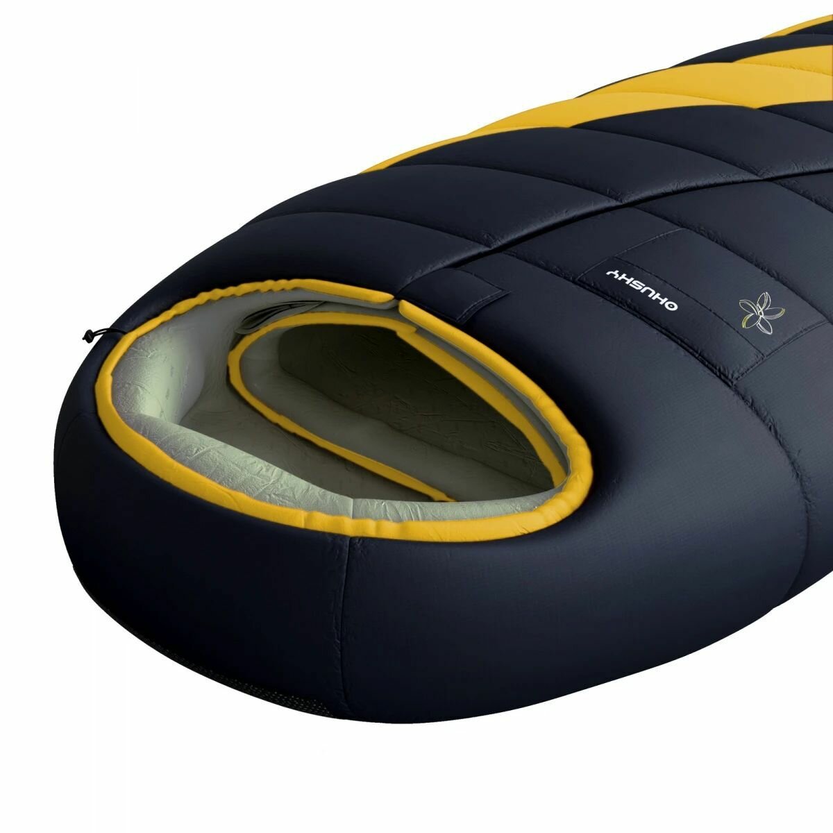 Уникальные детали: теплоизоляционный воротник, антискользящие полосы, микрофлис в нижней части, двухсторонняя молния, карман для телефона, компрессионный мешок, возможность состегивания двух спальников