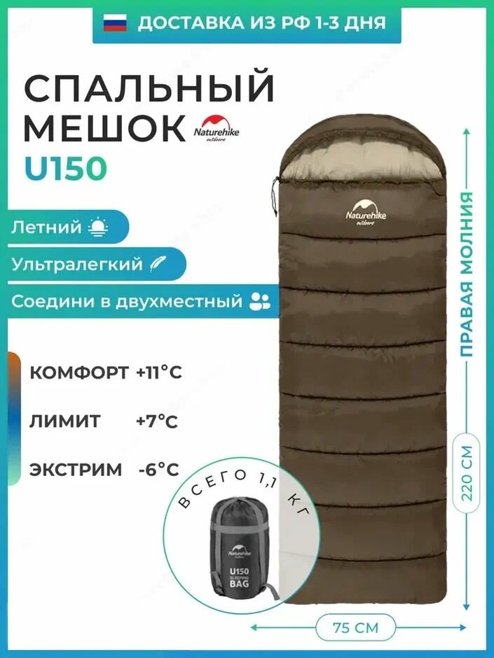 Спальный мешок Naturehike u350s / до -17C, вес 1.7 кг, коричневый, молния справа / превращается в двухместный спальник