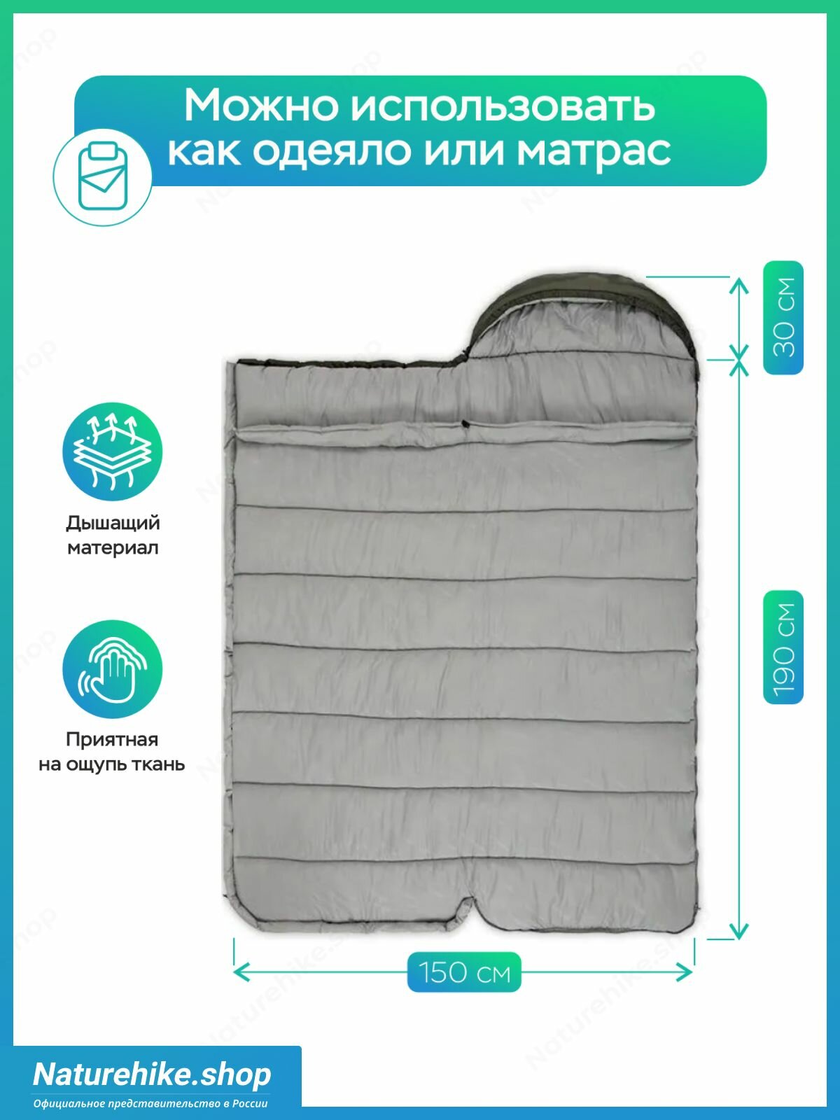 Спальный мешок Naturehike u350s / до -17C, вес 1.7 кг, зеленый, молния слева / превращается в двухместный спальник