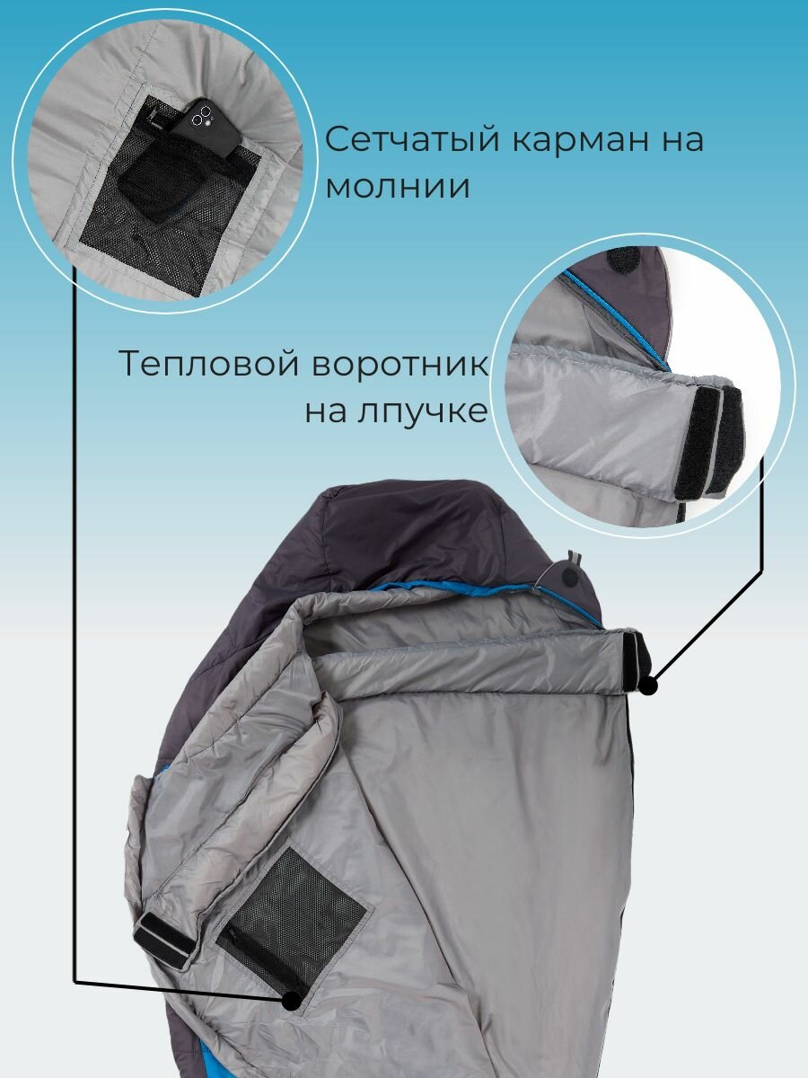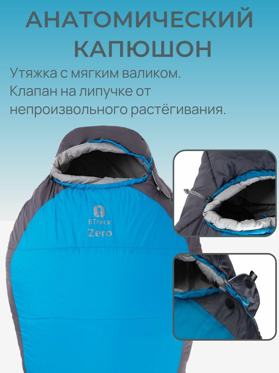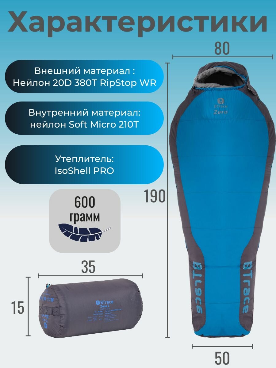 Он идеально подойдёт для небольших путешествий в теплую погоду. Занимая совсем мало места, этот спальный мешок позволит с комфортом переночевать в походных условиях. Как и другие спальные мешки-коконы этой серии, BTrace Zero имеет возможность состёгиваться.
