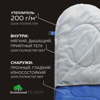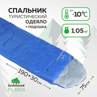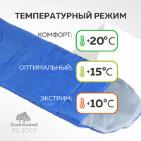 Легкий вес позволяет легко переносить спальник и использовать в различных условиях. Туристический спальный мешок продается в комплекте с прочным чехлом из оксфорда, плотностью 150D с полиуретановым напылением, которое поможет сохранить спальник сухим и чистым (РU1000мм). Спальный мешок Greenwood FS-1003 сконструирован по принципу одеяло + подушка (подголовник). Немаловажный параметр при выборе спального мешка – температурный режим. Необходимо выбирать параметры спальника в зависимости от погодных и температурных параметров похода. Максимальная температура данной модели + 20°C, температура комфорта +15°C, экстремальная температура +10°C. Размеры спального мешка Greenwood FS-1003: 190 + 30 х 75 см. В свёрнутом виде габариты спальника составляют: 37*20*20см. Вес: 1,05 кг. По своим характеристикам и параметрам модель не уступает аналогичным спальным мешкам таких брендов как: Larsen, армия россии, декатлон, gamma, ami