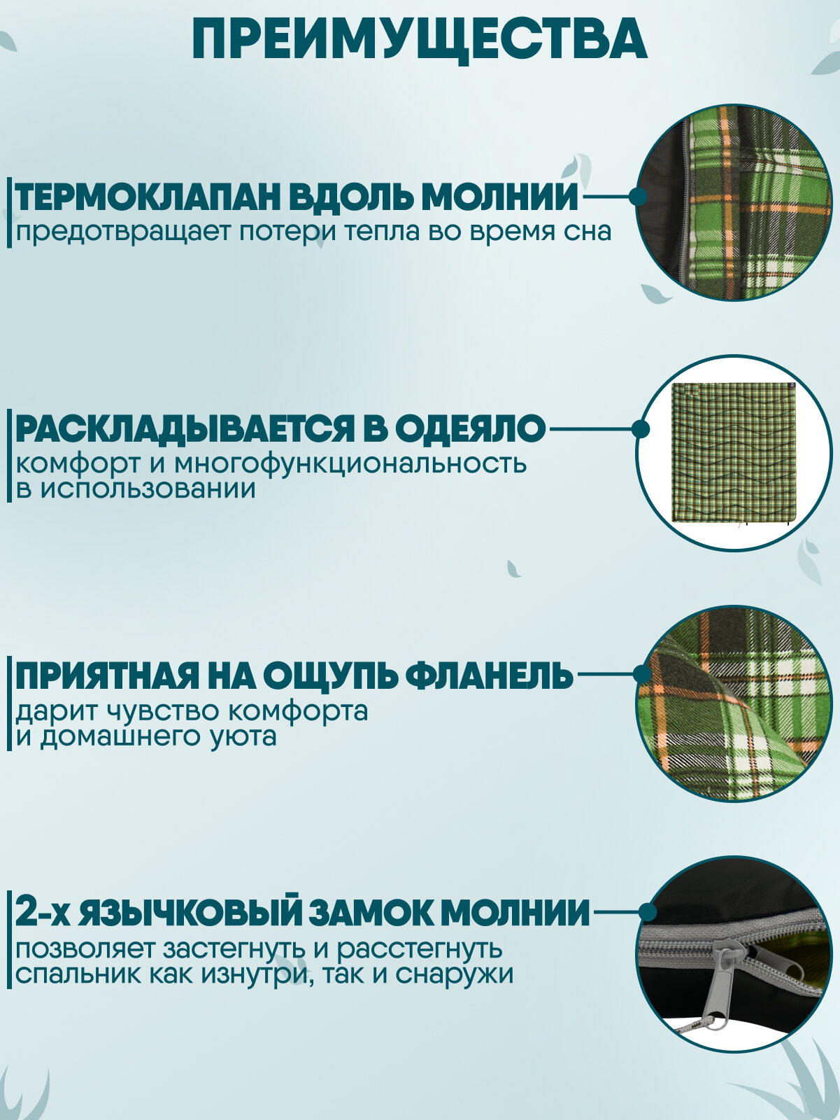 Внутренний материал: мягкая и приятная на ощупь фланель L-образная молния Термоклапан вдоль молнии Возможность состегивания спальников между собой Молния с левой стороны Внутренний карман Небольшой вес Чехол для удобного хранения и переноски