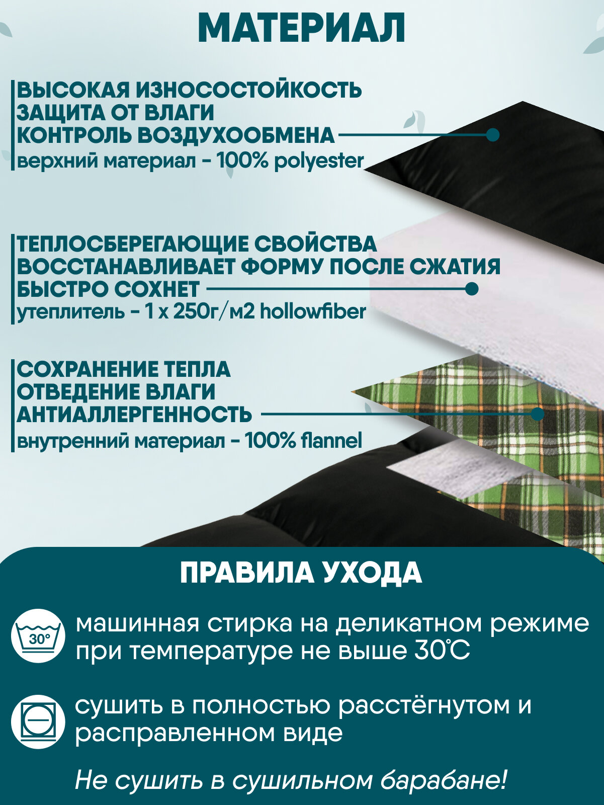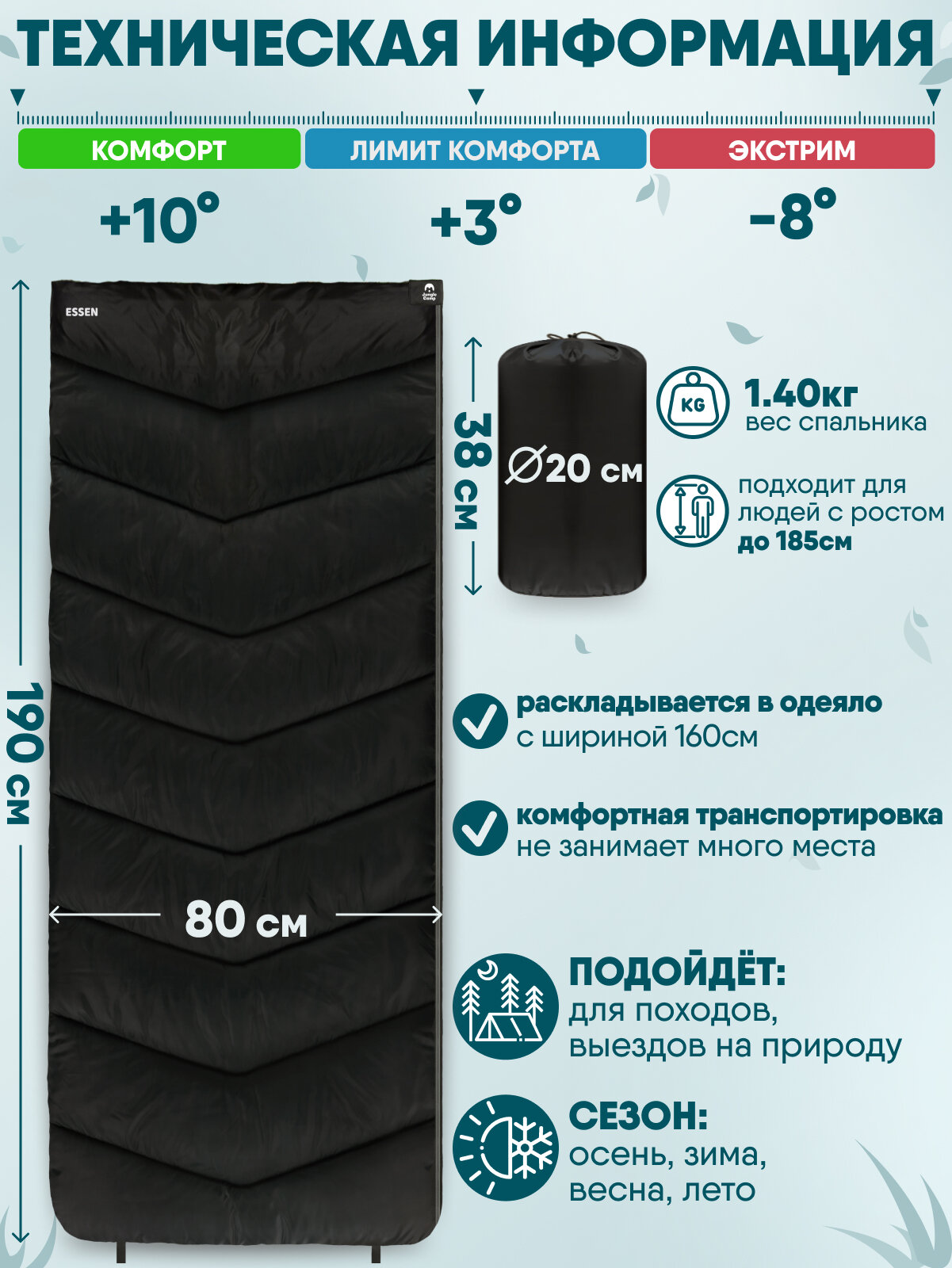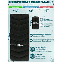 Цвет: черный t° комфорт: 12°C t° лимит комфорта: 7°C t° экстрим: -2°C Внешний материал: 100% полиэстер Внутренний материал: Фланель Утеплитель: Hollowfiber 1х200 г/м2 Размер: 190 см х 80 см Размер в чехле: 20 см х 20 см 38 см Вес: 1,1 кг Производитель: Россия