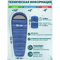 Цвет: синий/серый t° комфорт: 10°C t° лимит комфорта: 5°C t° экстрим: -8°C Материал: 100% полиэстер Внутренний материал: Полиэстер Pongee Утеплитель: Hollowfiber 1х300 г/м2 Размер: 175 см х 70(40) см Размер в чехле: 20 см х 20 см х 35 см Вес: 0,85 кг Производитель: Россия