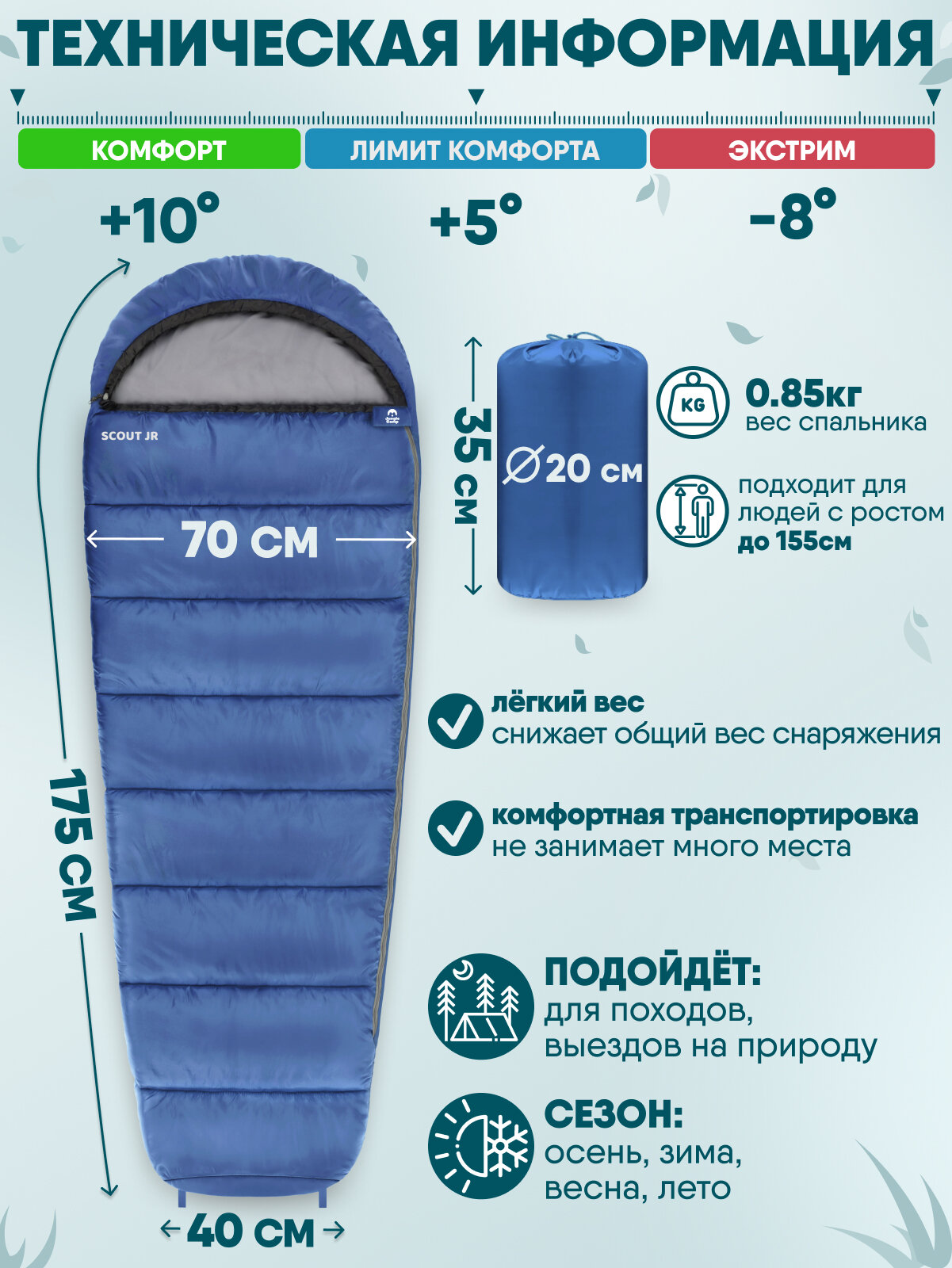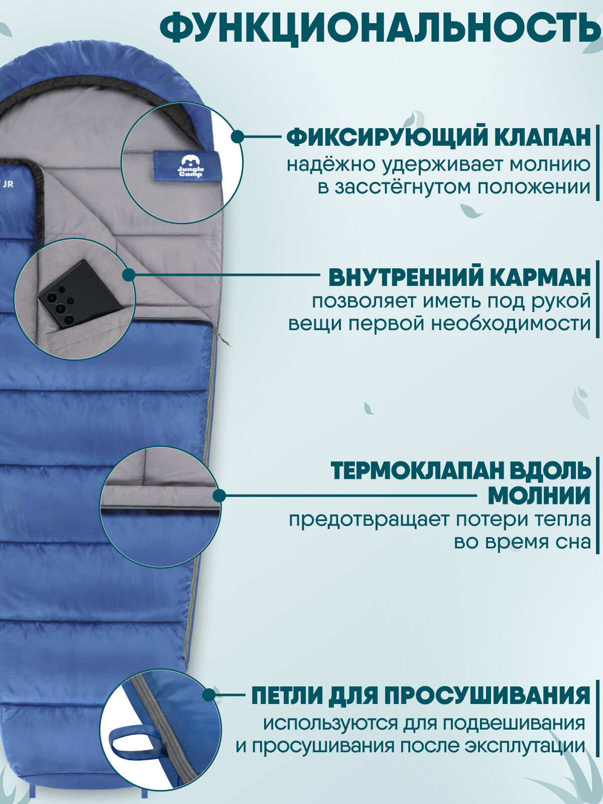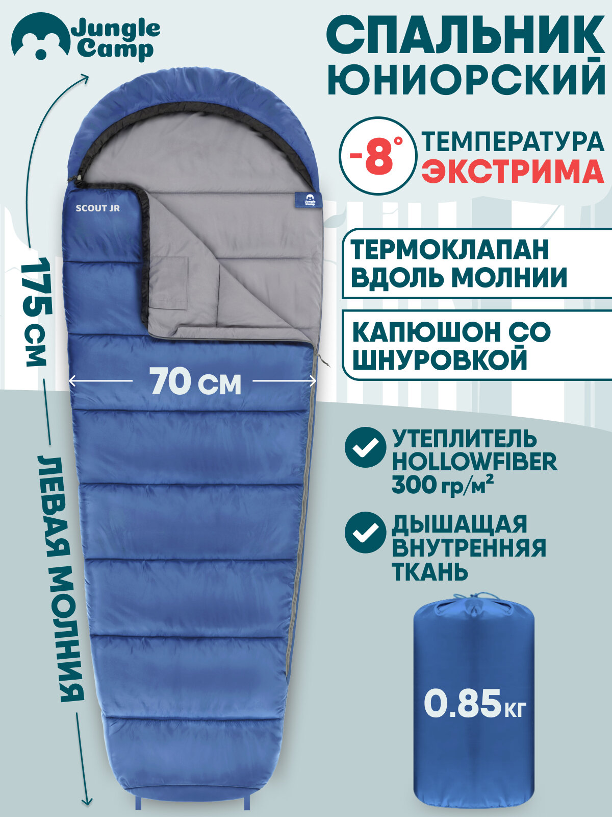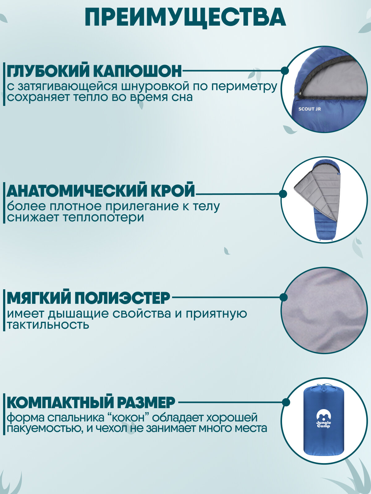 Удобный и легкий спальник-кокон для детей и подростков Jungle Camp Scout JR - отличный вариант для любителей активного летнего отдыха. Внутренний материал спальника выполнен из приятного на ощупь полиэстера Pongee. В качестве утеплителя используется однослойный Hollowfiber с увеличенной плотностью 300 г/м2. Для просушки и проветривания в ногах спальника расположены петли, которые позволяют повесить спальный мешок на ветку или веревку. Расположенный вдоль всей молнии термоклапан защищает от проникновения внутрь спальника холодного воздуха.