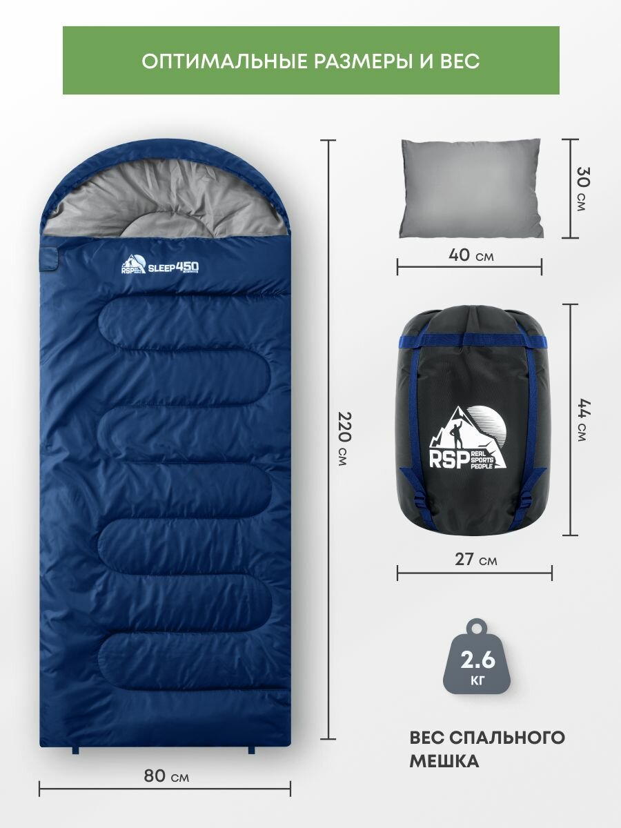 Cпальный мешок туристический с подушкой Sleep 450 от компании RSP – отличный выбор для комфортного сна на природе. Cпальный мешок с подушкой можно использовать с ранней весны до поздней осени, конечно в зависимости от температуры воздуха в конкретном регионе. Cпальный мешок туристический теплый идеально подойдет как для поездок на природу на автомобиле, так и для пеших или вело походов за счет малого веса и объема. Sleep 350 - это спальник одеяло туристический. Эта форма является наиболее комфортной и удобной, а молния с 2 сторон позволяет полностью расстегнуть спальный мешок хлопковый туристический и использовать его как одеяло либо постилку.