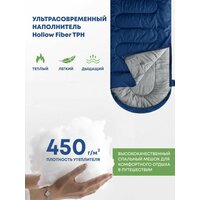 Cпальный мешок одеяло туристический поставляется в чехле для хранения, который изготовлен из материала Polyester Rip Stop 210T 68D W/R, обладающем водоотталкивающим эффектом. Чехол снабжен клапаном-утяжкой, а также ручкой для переноски. Стоит отметить, что для своих температурных показателей и размеров, RSP Sleep 450 спальник туристический легкий.