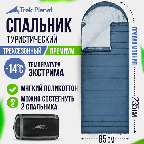 Комфортный и удобный спальник TREK PLANET BRISTOL COMFORT с большим анатомическим капюшоном предназначен для кемпинга в весенне-осенний период, когда возможны заморозки. В качестве внутреннего материала используется мягкий и приятный на ощупь поликоттон, имеющий хорошие гигиенические и гипоаллергенные свойства. Спальники BRISTOL COMFORT с левой и правой молнией можно состегнуть между собой, получив один двойной просторный теплый спальник. Вдоль молнии расположен термоклапан для защиты от проникновения холодного воздуха, уменьшающий потери тепла. Защита от заедания молнии в виде специальной ленты повышает удобство использования, позволяя максимально комфортно выбираться из спальника. Для хранения телефона или других ценных вещей предусмотрен внутренний карман.
