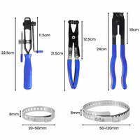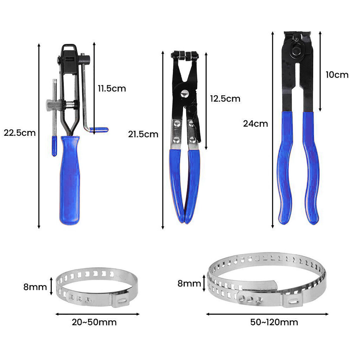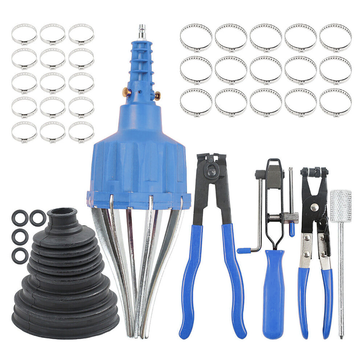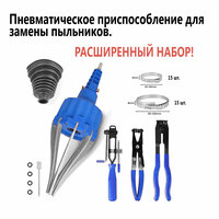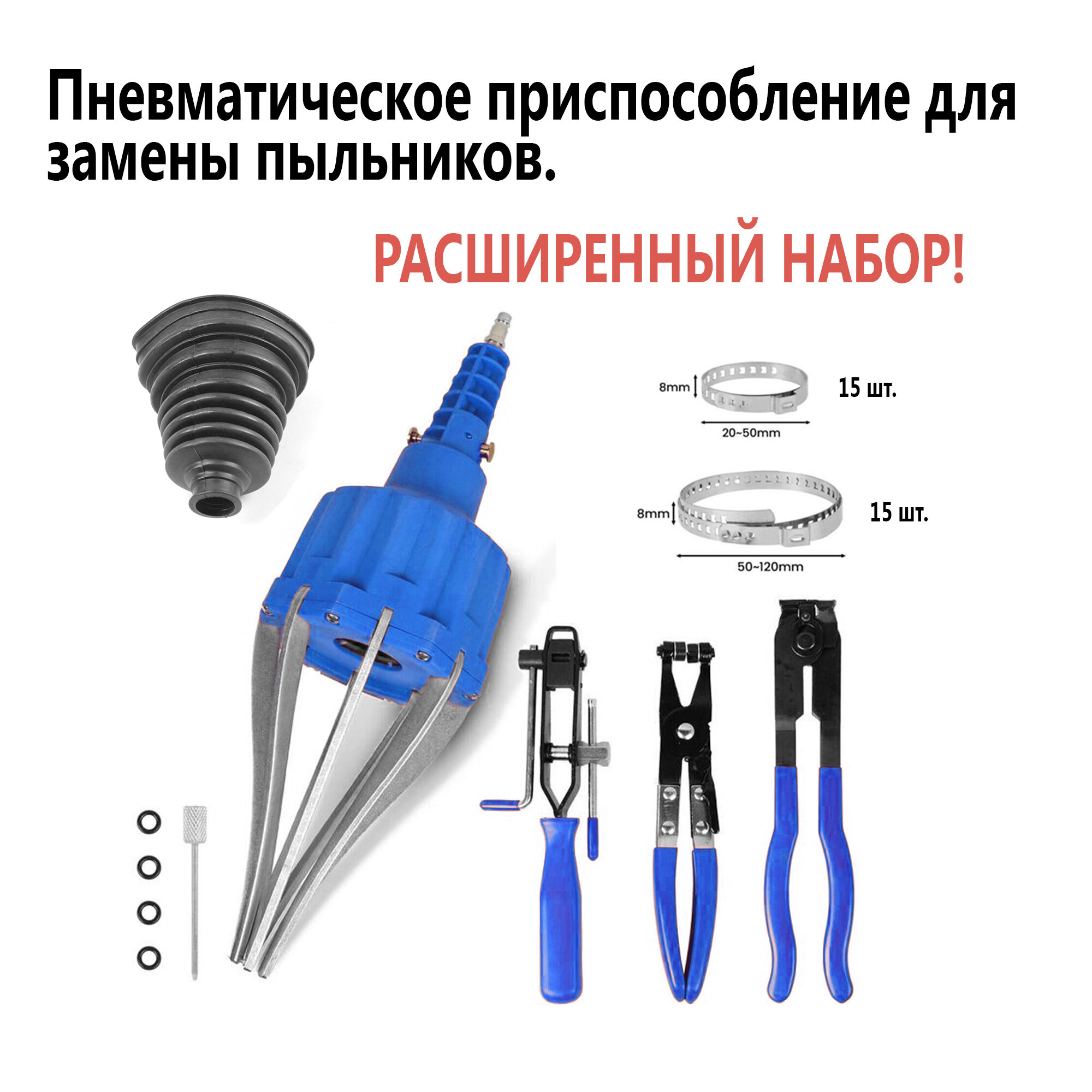 Приспособление для замены пыльника шруса и рулевой рейки пневматическое. Пыльник шруса. Хомуты 20-50мм - 15шт. Хомуты 50-120мм - 15шт. Инструмент(3шт): 1. Щипцы для ленточных хомутов ШРУС - Установка и фиксация хомутов пыльников ШРУС (шарнира равных угловых скоростей), патрубков системы охлаждения автомобиля и других ленточных хомутов с П-образным замком - 1шт.