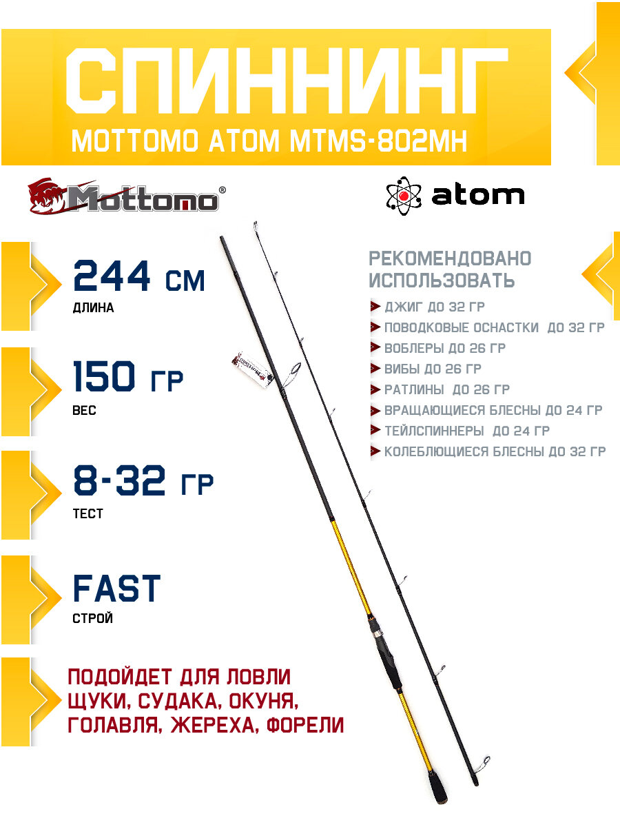 Купить Спиннинг Mottomo Atom MTMS-802MH 244см/8-32g на щуку, окуня, голавля, жереха. с доставкой по всей России. Спиннинг Mottomo Atom MTMS-802MH 244см/8-32g на щуку, окуня, голавля, жереха.: сравнение цен, характеристики, фото, актуальное наличие и цены.