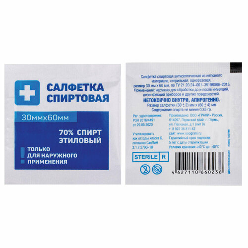 Спиртовая антисептическая стерильная салфетка из нетканого материала обеспечивает надежную обработку кожи и поверхностей. Применяется для:- дезинфекции рук и кожных покровов в стационаре и в быту; -подготовки операционного поля и мест проколов; -обработки кожи до и после постановки инъекций, заборов крови; обработки инструментов и различных поверхностей. Спиртовая салфетка пропитана раствором 70% этилoвого cпиpта и обладает выраженным противомикробным, антибактериальным и антисептическим эффектом. Антисептическая салфетка не оставляет на поверхности кожи волокнистых компонентов и не вызывает аллергических или местно-раздражающих реакций. Срок годности: 5 лет. Страна производства: Россия; Производитель: грани; Материал: Нетканый материал;