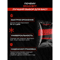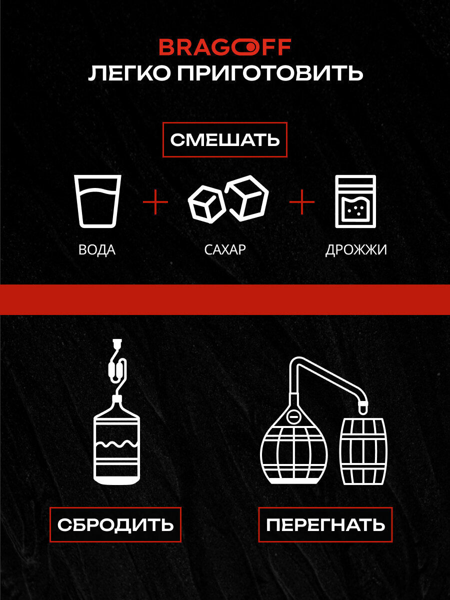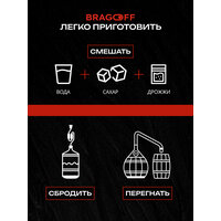 Быстрые самогонные дрожжи BRAGOFF - это : проверенный гидромодуль для приготовления 1/4, где 1 часть сахара, 4 части воды; натуральные ингредиенты в составе, непосредственно влияющие на качество получаемого спирта; стабильный процесс брожения без пенообразования; повышенный контроль качества на производстве; отсутствие постороннего запаха и вредных побочных примесей в готовом спиртовом продукте.
