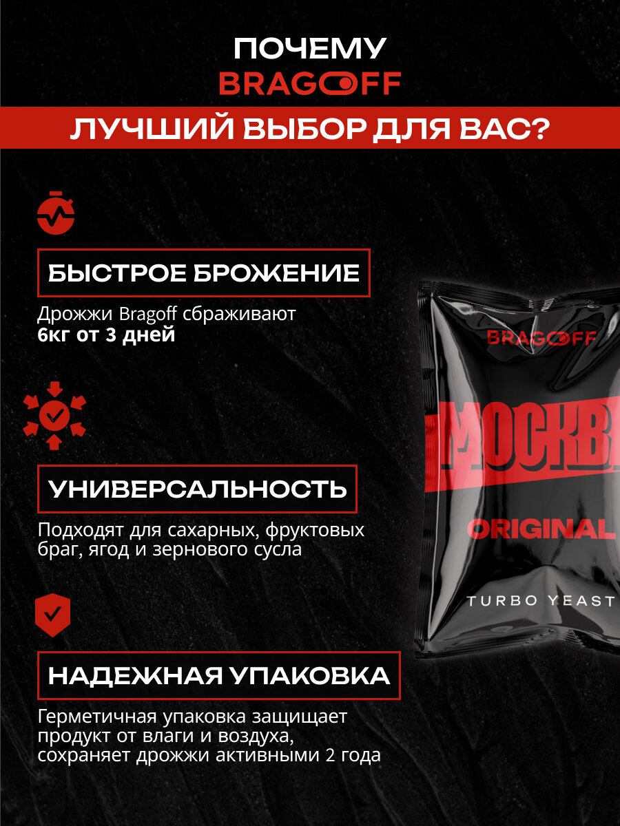 Это отличное решение для подарка любителям самогоноварения: Turbo Yeast BRAGOFF Москва предоставляет широкий простор для экспериментов с рецептами и подходит для сахарных, зерновых и фруктовых браг. Условия хранения Хранить в сухих проветриваемых помещениях не выше 25℃ и относительной влажности не более 75%