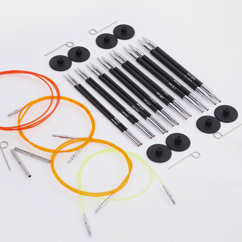 | Комплектация | В набор входит 7 пар съемных карбоновых спиц укороченной длины (длина спицы 9 см): 3,5мм, 3,75мм, 4мм, 4,5мм, 5мм, 5,5мм, 6мм. 2 тросика, с помощью которых можно создать круговые спицы длиной 40см – 2шт, заглушки – 4шт, ключик – 2шт, классификатор размера спиц. Набор упакован в жаккардовый оганайзер с прозрачной крышкой. |