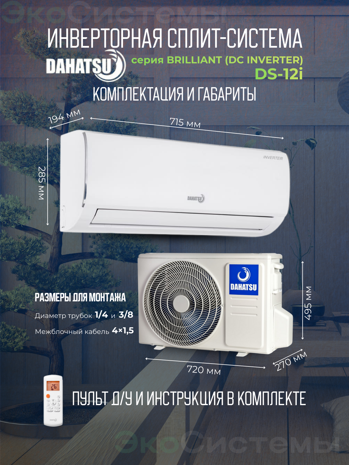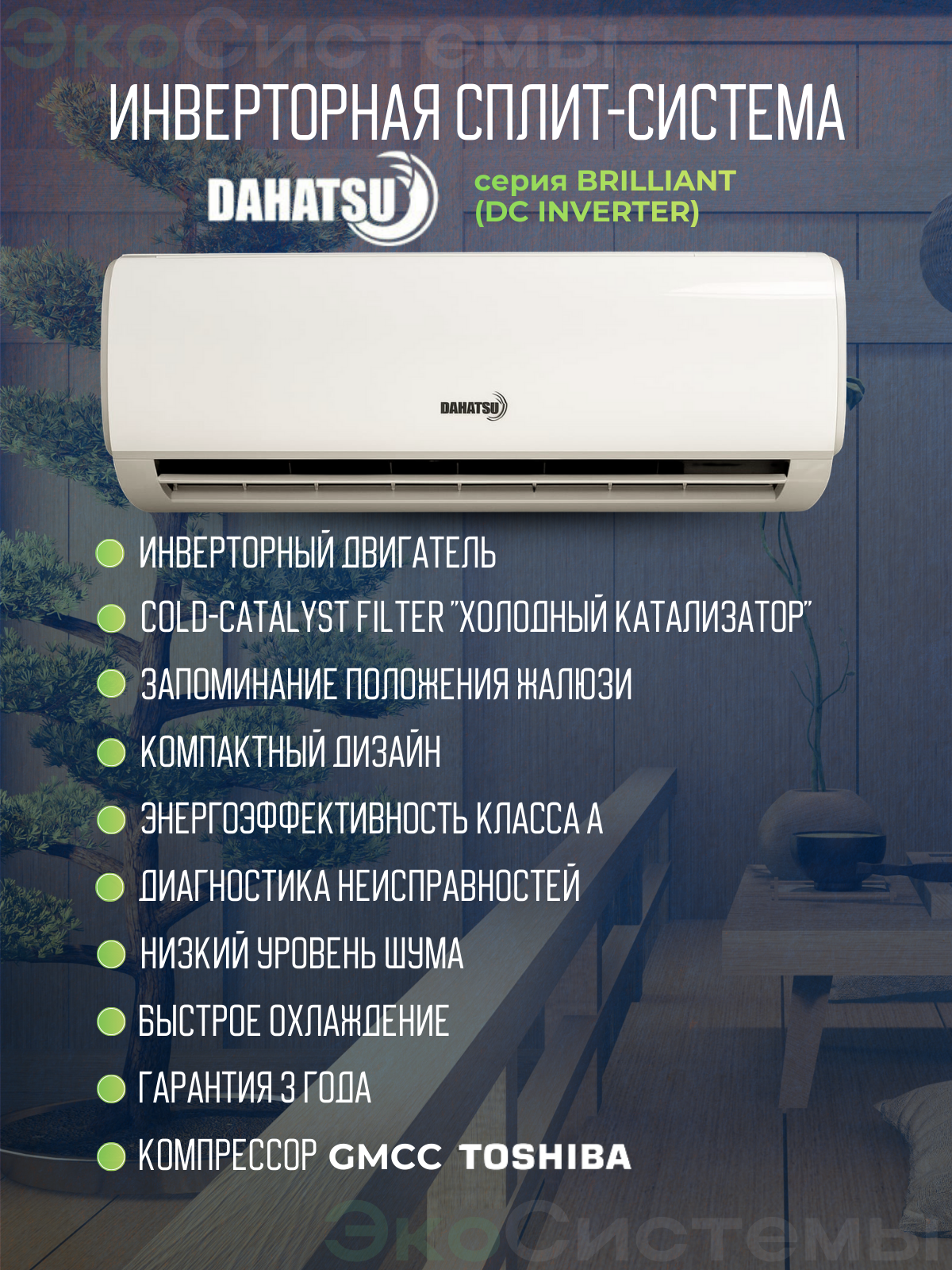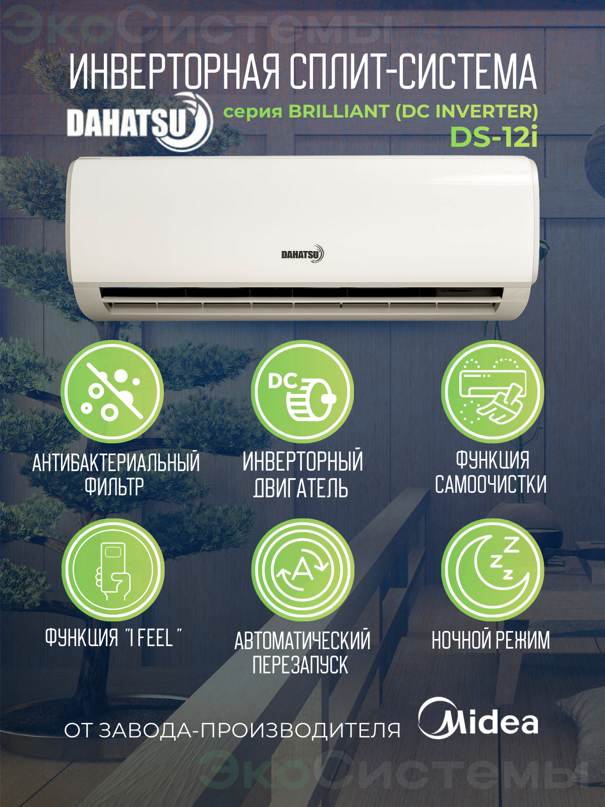 В настенном кондиционере Dahatsu (Дахатсу) DS-12I /DSN-12I плавные формы корпуса выполнены из пластика с защитой от УФ-лучей. Благодаря японскому компрессору Toshiba с инвертором температура в помещении точно поддерживается в заданных пользователем пределах. Инвертор работает почти постоянно, что снижает потребление энергии и колебания температуры в помещении. Особенности и преимущества: Стильный, компактный и супер тихий3 фильтра очистки воздухаНадежная защита наружного блока от температурных перепадовБольшой набор функций и режимовКонтроль неисправностейСветодиодный LED дисплейАвтоматическое поддержание температурыАнтибактериальный фильтр, фильтр с витамином С и механическийКомпактный дизайнПокрытие теплообменника Golden FinХолодный катализатор (Cold-Catalyst Filter)Возможность регулировки направления воздушного потокаСистема против образования льдаФункция запоминания настроекНастенные инверторные кондиционеры Dahatsu серии BRILLIANT модельного ряда 2021 отличаются усовершенствованным дизайном, отличной эргономикой и оптимальным набором функций. Современное оборудование оснащено системой самодиагностики, системой самоочистки и надежной системой защиты от перенапряжения. В моделях установлены современные, качественные и надежные японские компрессоры. Пульт дистанционного управления поставляется с агрегатами. Линия серии представлена стандартными моделями с производительностью 07k, 9k, 12k, 18k и 24k. Cold-Catalyst Filter «Холодный катализатор»В данном фильтре используется пластина с нанесенным на нее диоксидом титана (катализатором). При попадании естественного солнечного света на пластину через специальные отверстия внутреннего блока кондиционера, все загрязнители расщепляются на простейшие вещества под действием диоксида титана, нанесенного на ее поверхность. Таким образом, фильтр очищает воздух от большинства вредных примесей, в том числе от вирусов и газовых загрязнений. Еще одной особенностью «Cold Catalyst» фильтра является то, что его эффективность не уменьшается в процессе работы. Golden finЗолотое покрытие оребрения теплообменника- Защита от коррозии. Специальное антикоррозийное покрытие теплообменника, защищающее от атмосферных явлений и воздействий агрессивной внешней среды. Класс энергоэффективности АОпределенный класс присваивается прибору в зависимости от количества киловатт, которое он потребляет. Каждая буква маркируется на определенном фоне, цветовая гамма которого меняется от зеленого к желтому и затем к ярко-красному. Буква А, на зеленом фоне, означает высокий показатель энергоэффективности техники. низкий уровень шума - 22 ДБ(А)Уровень шума внутренних блоков — от 22 дБ(А). Благодаря специально спроектированному вентилятору внутреннего блока и двойной шумоизоляции компрессора кондиционер работает тихо, обеспечивая хорошие условия для работы и отдыха. Технические характеристики Dahatsu BRILLIANT DC INVERTER 2021МодельDS-12I / DSN-12IОхлаждение: Производительность, Вт3500(1500-3850)Потребляемая мощность, Вт1045(280-1393)Номинальный ток, А4,5(1,2-6,0)Коэффициент, EER3,35Обогрев: Производительность, Вт3600(1550-3950)Потребляемая мощность, Вт990(300-1442)Номинальный ток, А4,4(1,3-6,2)Коэффициент, EER3,64Максимальный потребляемый ток, А10,5Максимальная потребляемая мощность, Вт2250Электропитание, V/PH/HZ220-240V,50HZСтепень защиты, IP (внутр/внешн)IPX4/IPX4Класс защиты электрической сети (внутр/вне