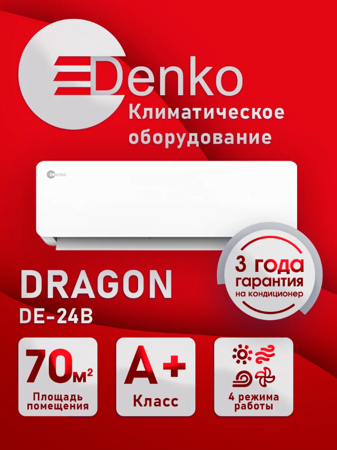Купить Сплит-система Denko DE-24B, площадь 70 м², A-класс энергопотребления с доставкой по всей России.