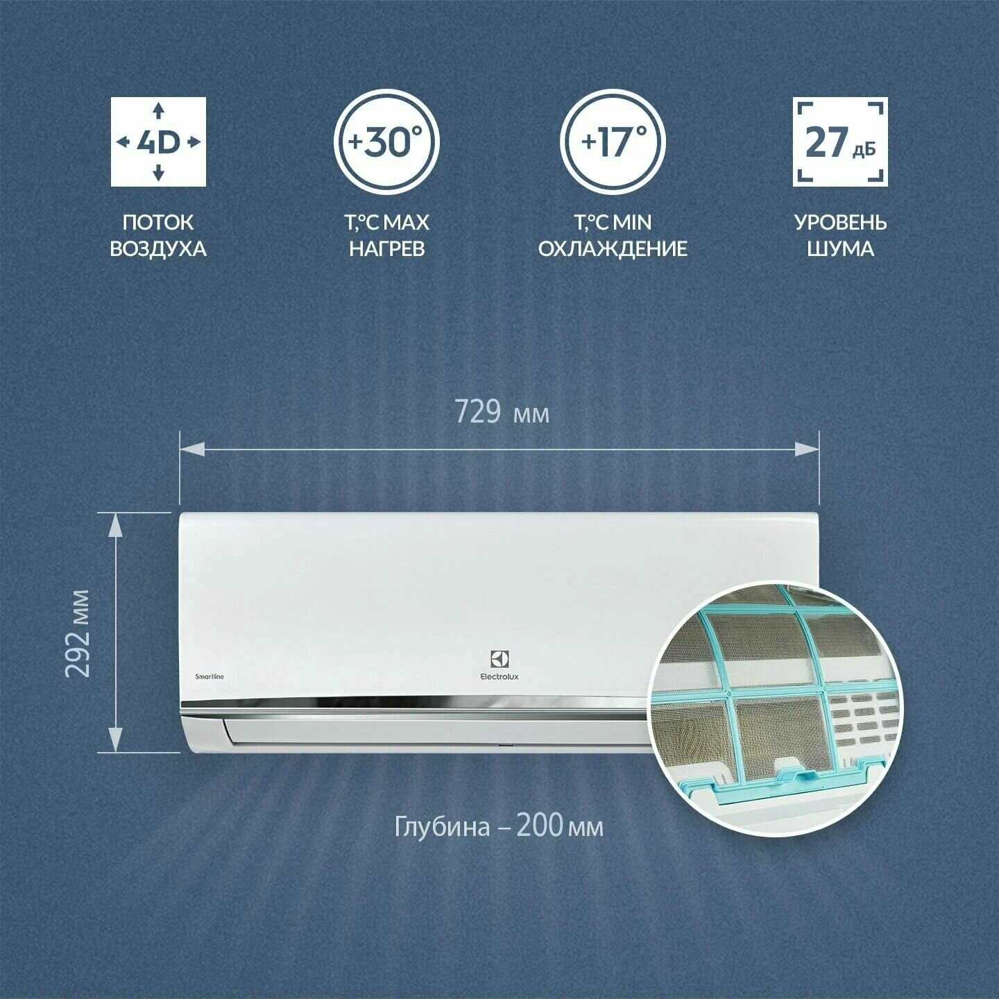Выбирая сплит-систему Electrolux Smartline, вы получаете надежный и стильный прибор, который дополнит любой интерьер. Данная модель станет вашим верным помощником в создании максимально комфортной атмосферы в любое время года. Не упустите возможность улучшить свой дом с помощью этого эффективного кондиционера.