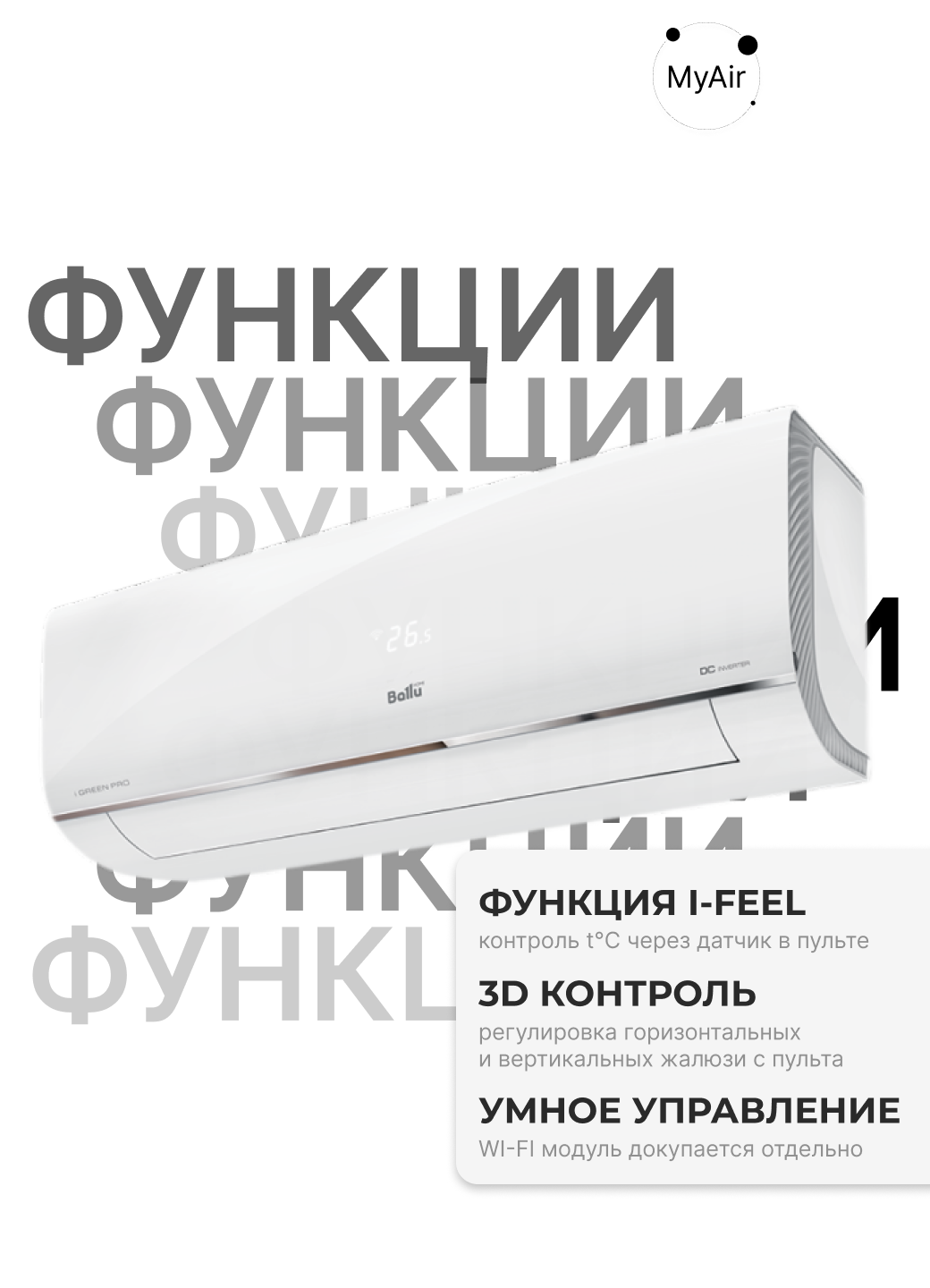 | Дополнительные функции | Follow me, автоперезапуск, ионизация, разморозка внешнего блока, самодиагностика, самоочистка внутреннего блока, система против образования льда, теплый пуск |