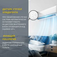 | Дополнительные функции | Follow me, автоперезапуск, разморозка внешнего блока, самодиагностика, самоочистка внутреннего блока, система против образования льда, теплый пуск |