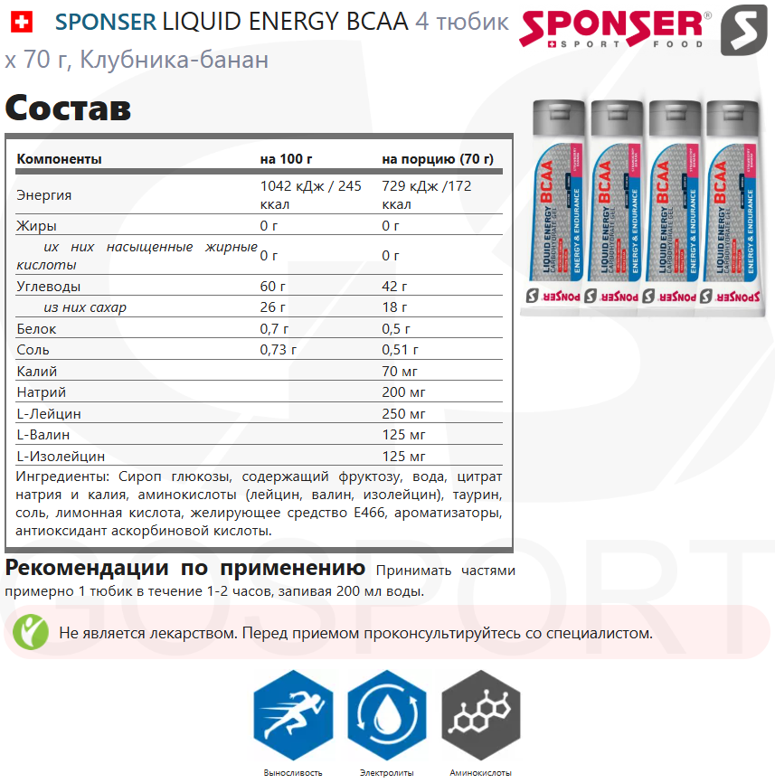 Идеально для длительных нагрузок и регенерации. Принимать частями примерно 1 тюбик в течение 1-2 часов, запивая 200 мл воды.