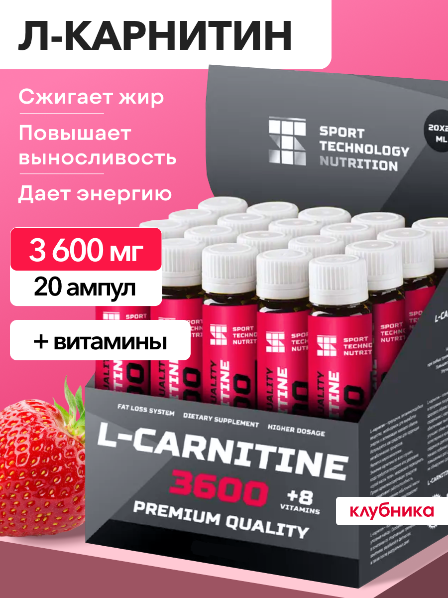 L-карнитин 3600мг, SPORTTECH, вкус клубника, 20 ампул*25 мл, жиросжигатель, похудение, энергия, выносливость, тонус