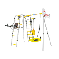 Комплектация комплекса включает в себя баскетбольный щит, грушу боксерскую, брусья, канат, кольца с перекладиной, гимнастическую лестницу, рукоход, турник подвижный и качели "Гнездо". Диаметр баскетбольного кольца составляет 30 см, а вес комплекса - 63,3 кг.