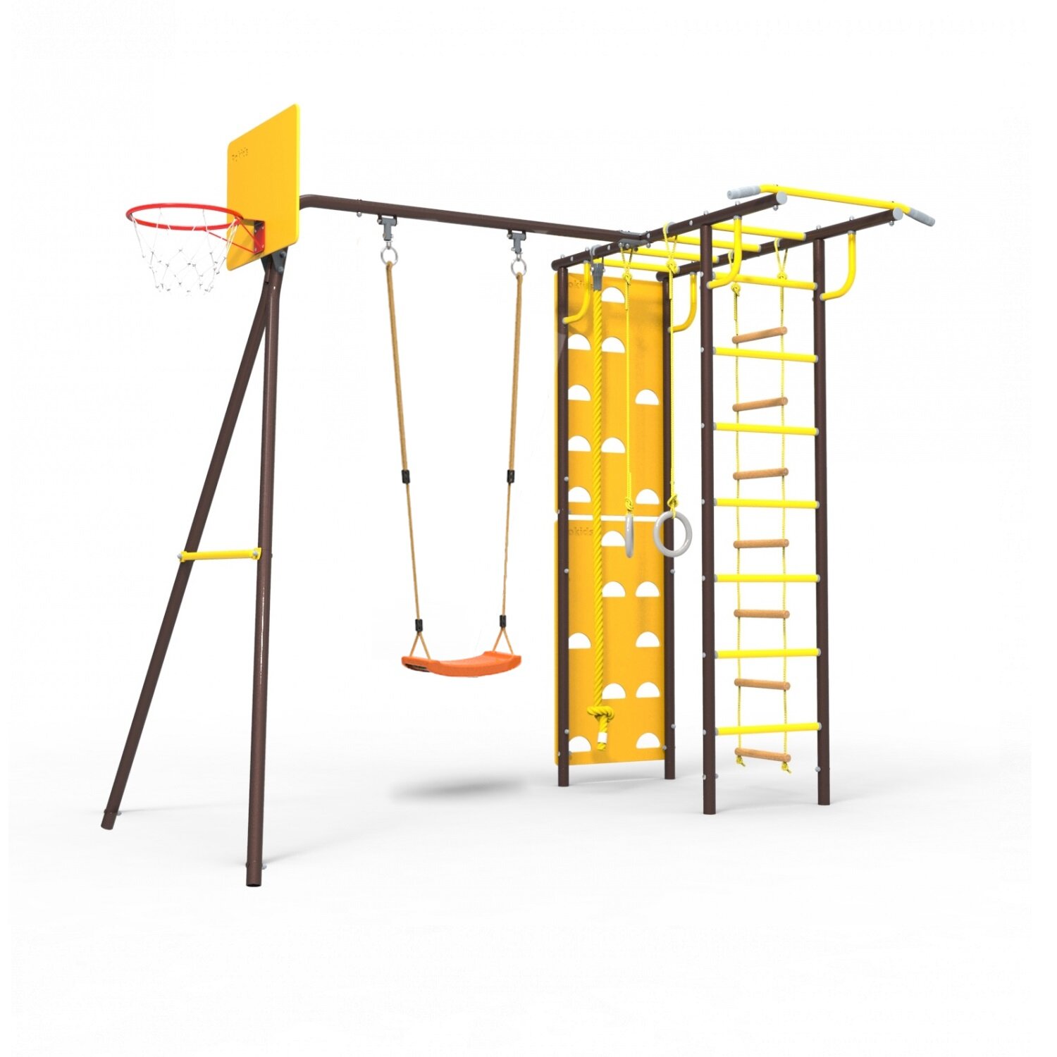 — В комплектацию входят: рукоход, кольца гимнастические, канат, кольцо баскетбольное, лестница веревочная, турник, скалодром, подшипниковые опоры для качели, ступени ПВХ и качели.