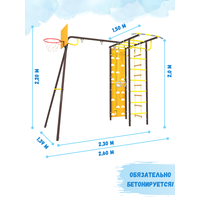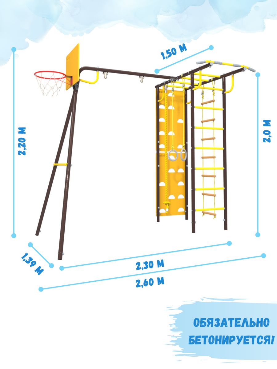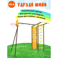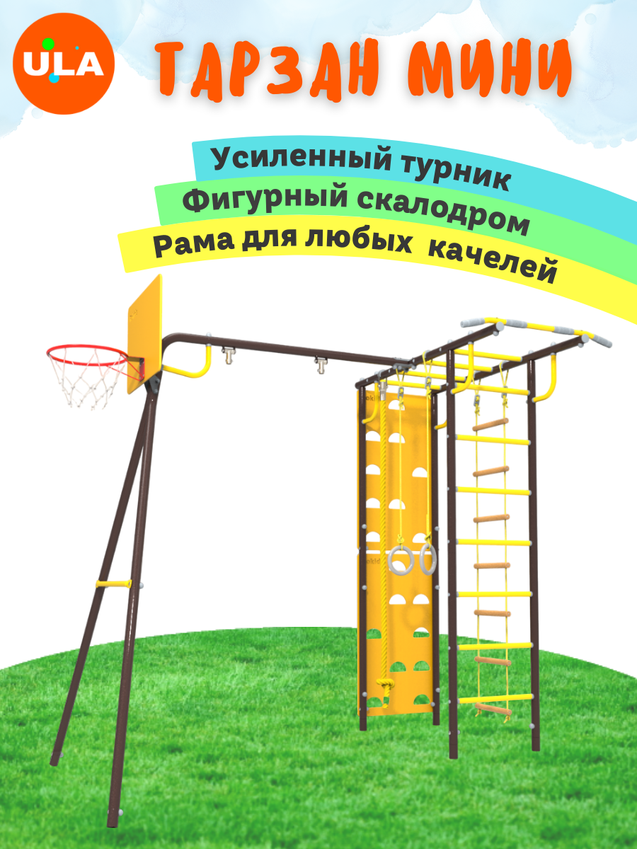 В комплектацию удск "Тарзан Мини" входит: рукоход, кольца гимнастические, канат, кольцо баскетбольное, лестница веревочная, турник, скалодром.
