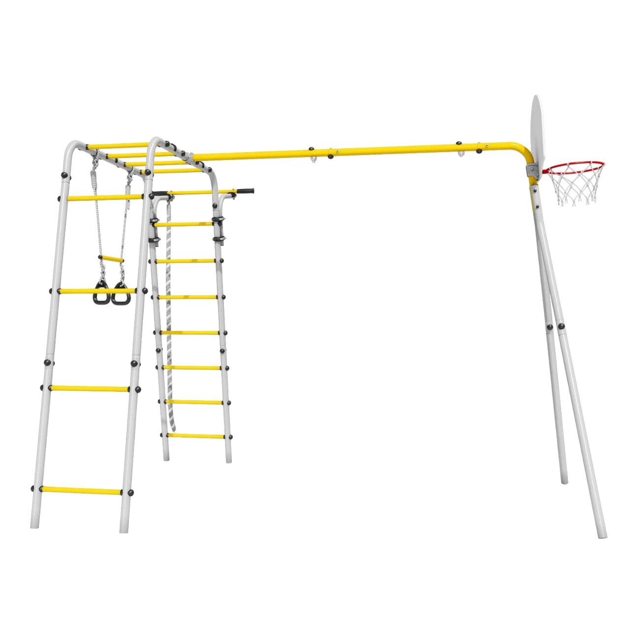 | Подробная комплектация | шведская стенка, рукоход, турник, канат, кольца гимнастические с перекладиной, баскетбольное кольцо со щитом, качели |