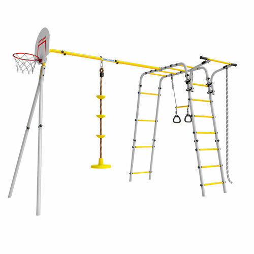 Комплектация комплекса включает в себя баскетбольное кольцо (d=0,3 м), канат, кольца с перекладиной, гимнастическую лестницу, рукоход, турник подвижный и качели диск. Допустимая нагрузка на турник составляет 100 кг, на навесное оборудование - 50 кг, а на комплекс в целом - 100 кг.