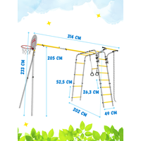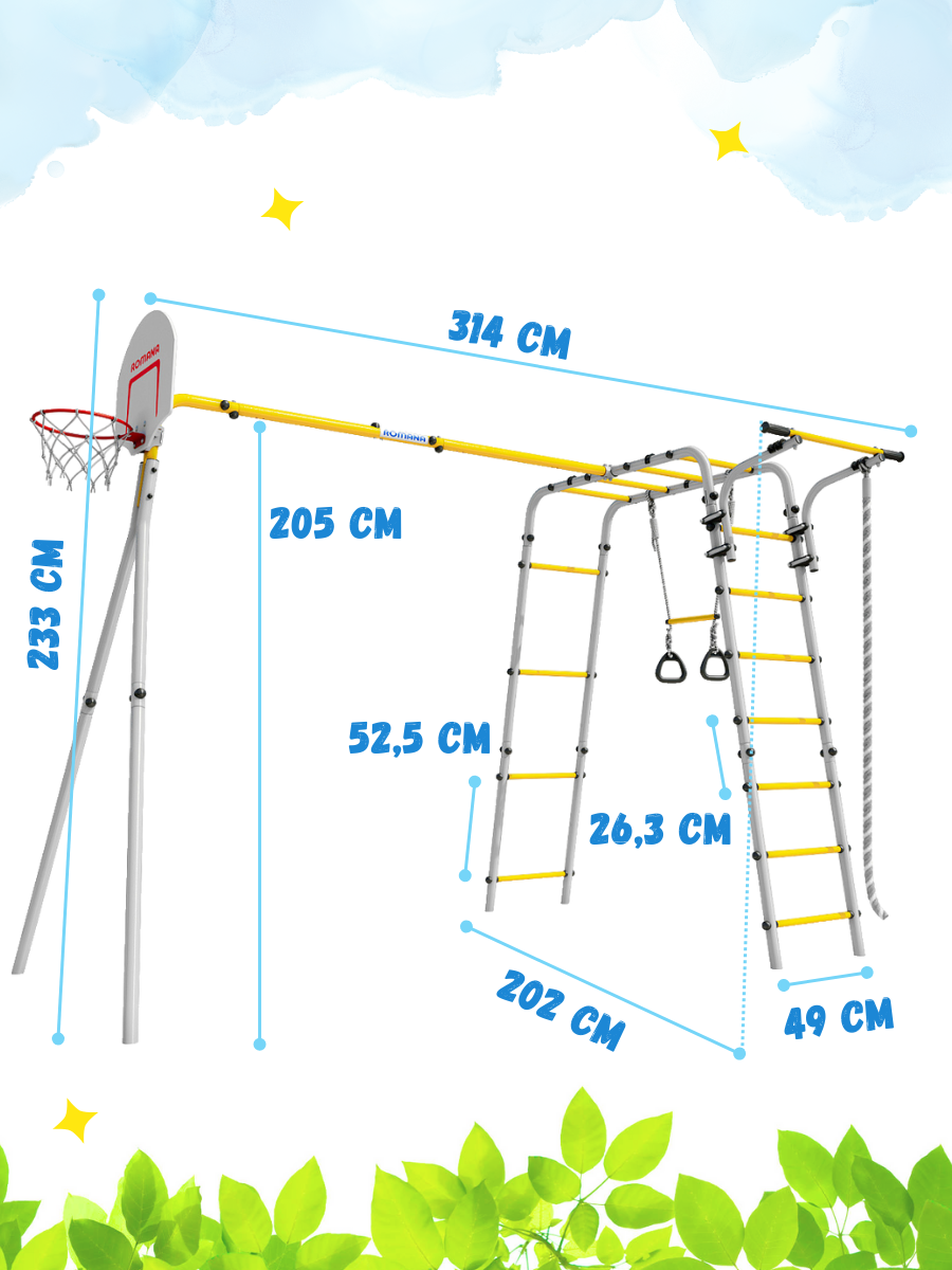 | Подробная комплектация | шведская стенка, рукоход, турник, канат, кольца гимнастические с перекладиной, баскетбольное кольцо со щитом, качели |